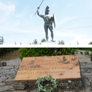 Desayunamos nuevamente el gran desayuno del hotel Orfeas, hotel muy recomendable para vuestra estancia en Delfos. Hoy nuestro destino final es Litochoro, ya que al día siguiente comenzamos la ascensión al monte Olimpo. Tenemos unas 3 horas de viaje en coche y decidimos parar por el camino a ver las Termópilas, que están a 1 hora de Delfos. Aquí fue donde se libró la batalla entre espartanos y persas, y que se cuenta en la película de 300. Hay una escultura y una placa conmemorativa. No es gran cosa, pero como hemos visto la película nos hacía ilusión hacer una parada para verlo.