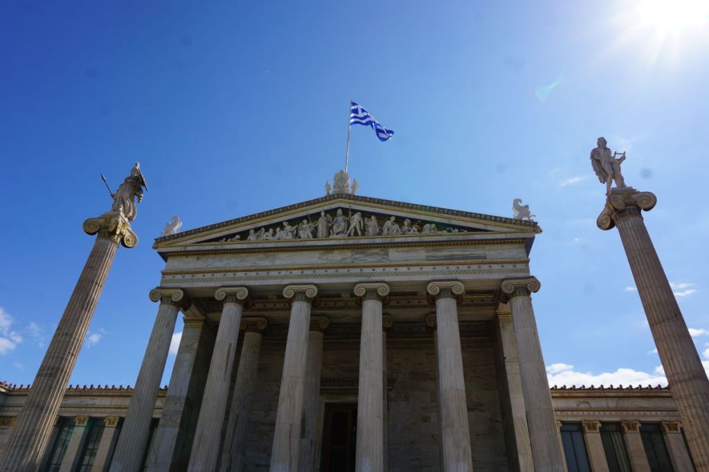 Trilogía de edificios neoclásicos: Biblioteca Nacional, Primera Universidad de Grecia y la Academia de Adriano. Tres edificios que están seguidos.