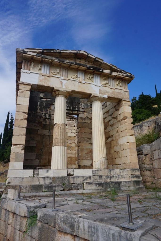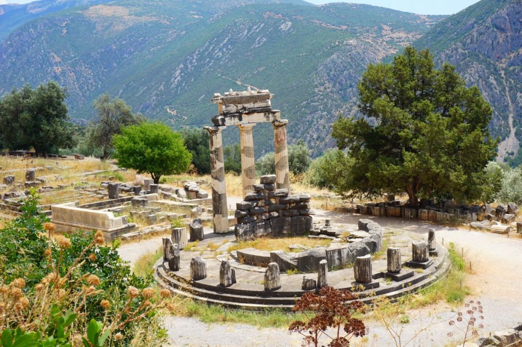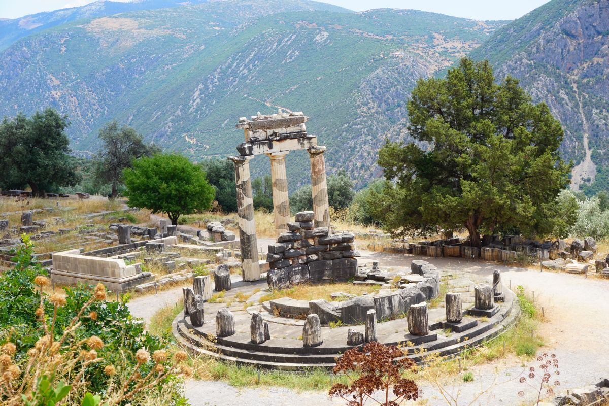 Estamos perezosos y no madrugamos mucho. El desayuno muy completo: café, zumo, tía mildred, cookies, un quesito del caserío, jamón y queso, un huevo duro, una nectarina, mantequilla y mermelada y rebanadas de pan, y lo mejor de todo: yogur griego casero con frutos del bosque (el mejor que vamos a probar en todo el viaje). Salimos andando hasta el yacimiento arqueológico de Delfos, que es un paseo de 10 o 15 minutos desde el hotel. Cuesta 12€ por persona y decidimos ver primero el yacimiento, luego el museo y finalmente el Oráculo de Delfos, que mucha gente no sabe, pero está fuera del recinto del yacimiento y es una de las imágenes características de Delfos.