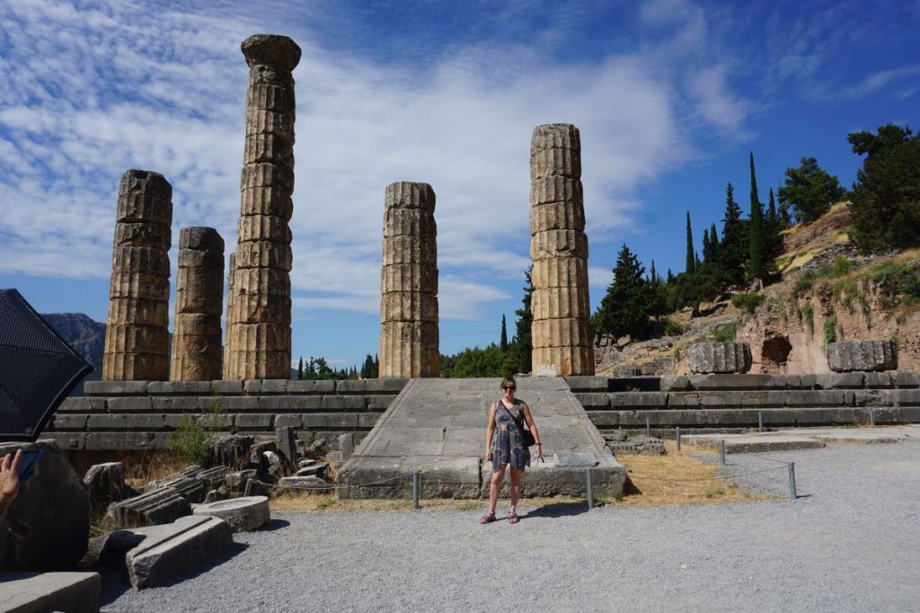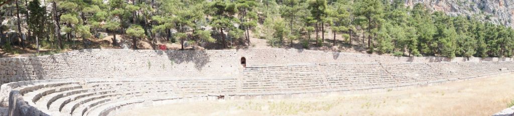 Dentro del yacimiento vemos el altar a Atenea, el templo de Apolo, el teatro y el estadio. Está en una colina y vas subiendo entre las ruinas hasta llegar al estadio, que es el que está más arriba. Nos gusta mucho. Es una pena que no tengan audioguías o visitas guiadas gestionadas por el propio yacimiento. La gente que acude con grupos organizados sí que llevan sus guías. Para las personas como nosotros que vamos por libre, solamente tienes unos carteles informativos, y queda un poco escaso para conocer la historia completa del lugar. Esto nos va a pasar en todos los yacimientos que vamos a visitar.