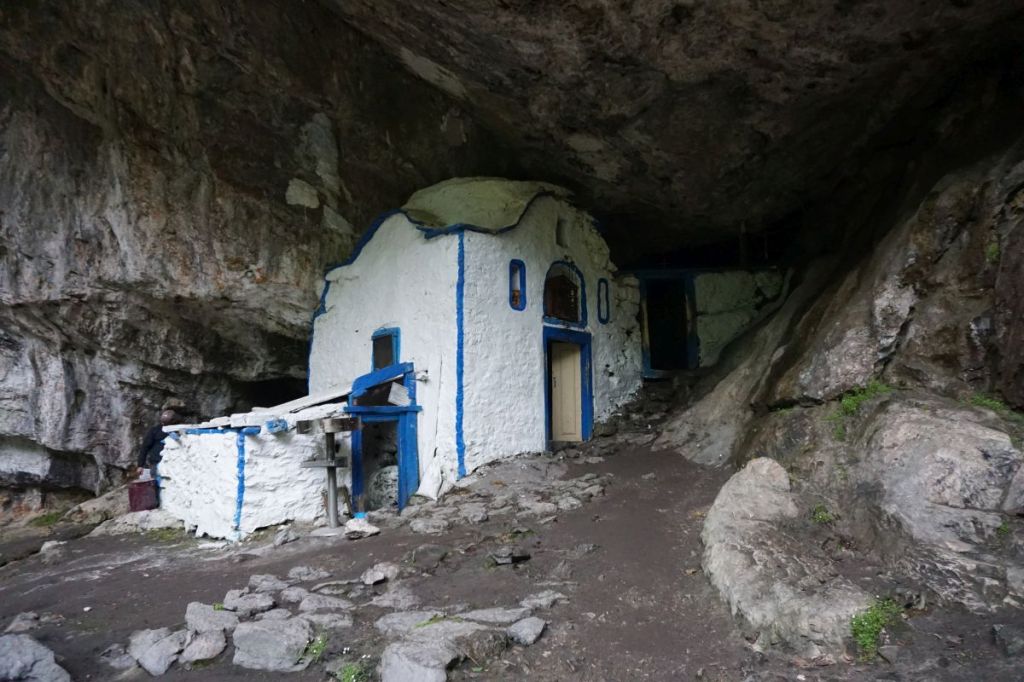 Dos kilómetros antes de llegar a Prionia, nos desviamos para ver el monasterio viejo de Dionisio. Aquí de momento nos respeta la lluvia. El monasterio estaba en ruinas y lo están arreglando. Muy bonito y tranquilo. Desde el monasterio nos hacemos una ruta de unos 20 minutos para ver una cueva que tiene un mini templo dentro. Conocemos dos chicos de Atenas. Nos dan información del Olimpo. Nos dice que la cumbre de Mytikas es peligrosa si no llevas casco, ya que caen piedras y hay alguna trepada. No nos lo recomiendan si está mojado.