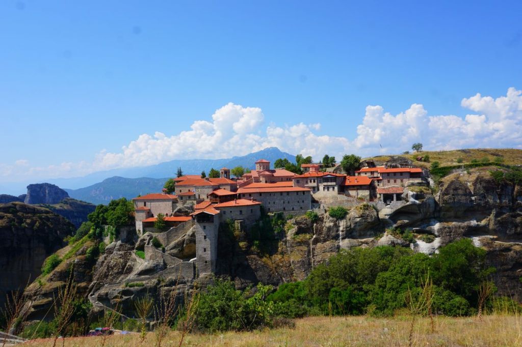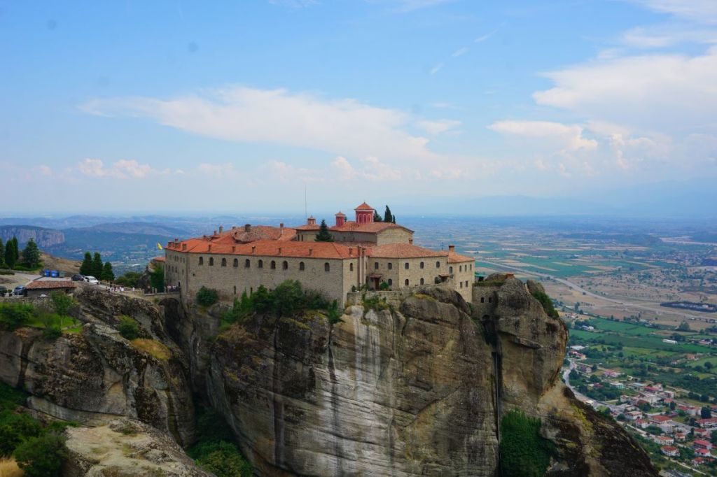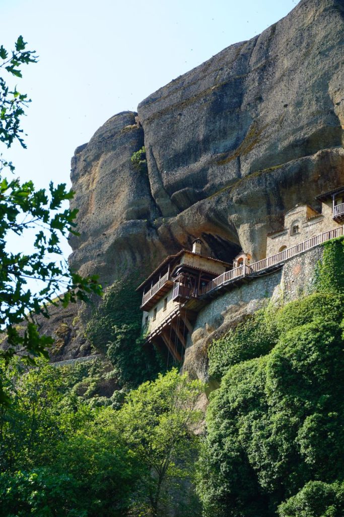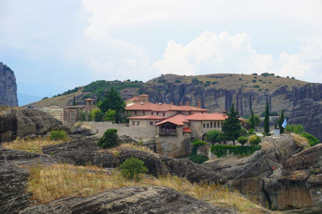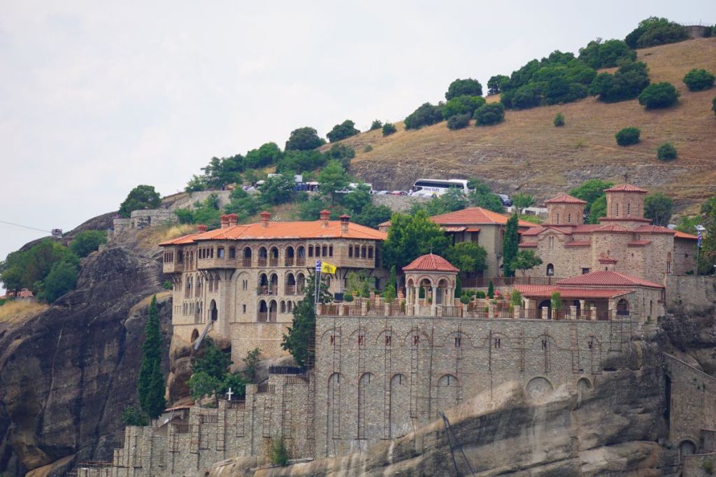 Llegamos hasta un alto donde vemos el monasterio de Varlaam, pero hoy está cerrado, así que continuamos hacia el monasterio Gran Meteoron, que es el que vamos a visitar. Hay que vestir con decoro en todos los monasterios, las mujeres no pueden ir con pantalones, aunque estos sean largos, por lo que a la entrada de los monasterio te dejan faldas. Si llevas un vestido que llega hasta la rodilla, entonces no hay problema. El guía nos da una hora para verlo. Es más que de sobra porque, aunque es grande, solo se pueden ver algunas zonas.