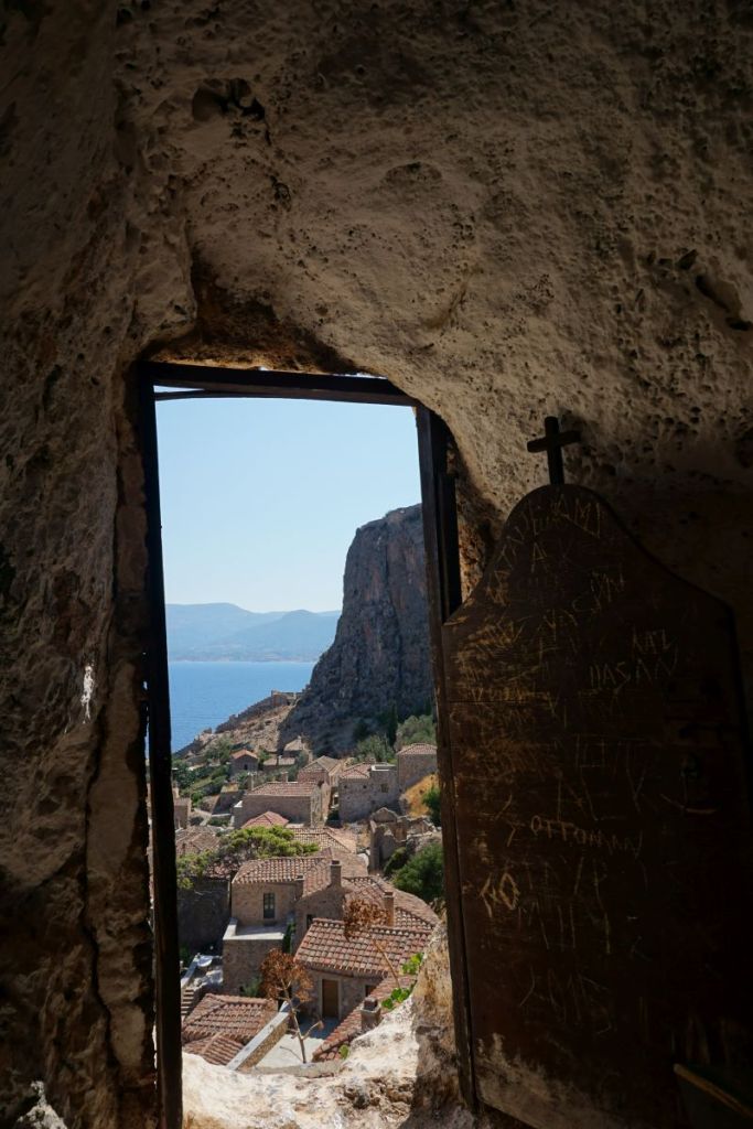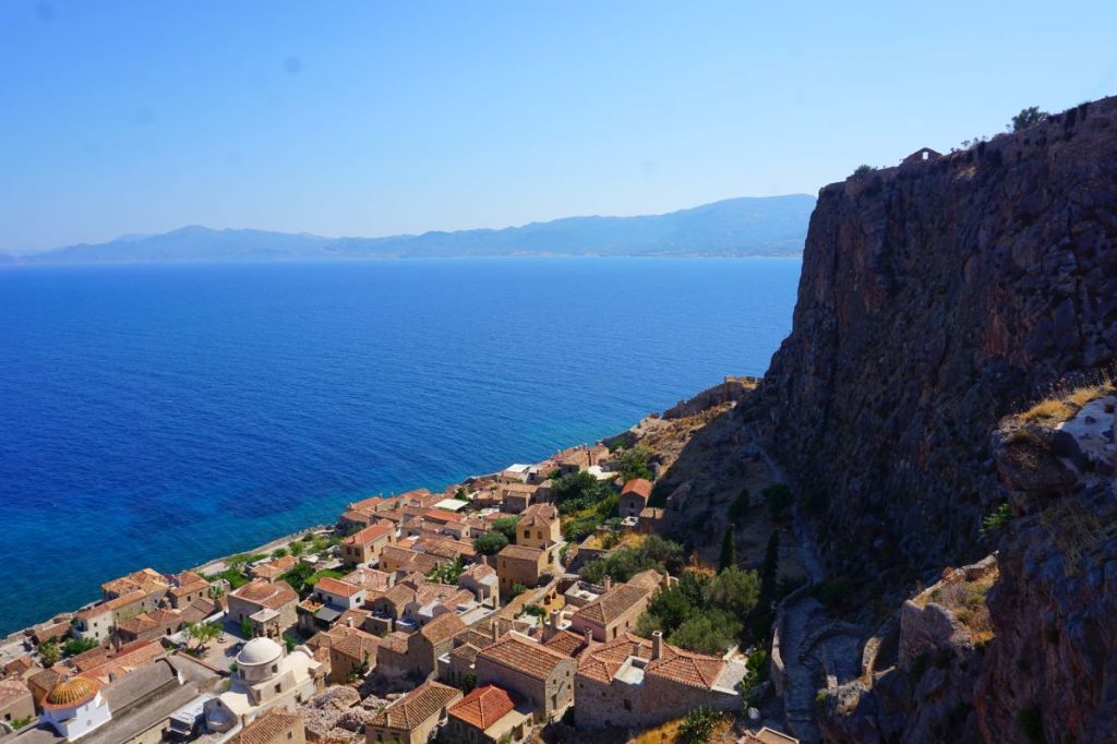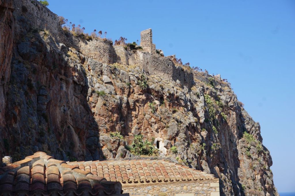 Ahora nos dirigimos a Monemvasia. En un primer momento no estaba dentro de nuestra ruta, pero cuando estuvimos en el monte Olimpo un señor americano nos lo recomendó, y decidimos modificar la ruta para conocer esta península, que es una especie de peñón de Gibraltar. Cuando llegamos nos quedamos en la parte del pueblo antes de cruzar el estrecho que lleva al peñón y nos fuimos a comer una greek salad, unas alitas de pollo barbacoa con patatas y una especie de sándwich muy rico. De postre nos sacaron helado. Nos dijeron que estaba mal para aparcar al otro lado y que mejor coger un bus que pasaba cada media hora. Justo llegamos a la parada cuando salía. Cogimos billete de ida y vuelta en la taquilla que está al lado de la parada, que nos cuesta en total 6€ por dos personas.