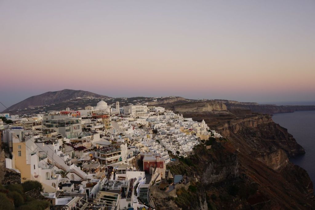 De ahí volvemos al camping Santorini Hostels sobre las 6 y pico de la tarde. Nos dan la habitación. Es una tienda un poco pequeña con cama pequeña. Descansamos un poco y vamos al centro de Fira andando. Vamos a la oficina del ferry para imprimir los ticket para ir a Naxos. Además hemos cogido online una excursión para mañana a las 14:00 de 20€ para ver la isla volcánica que está en la caldera, donde se pueden ver fumarolas, ademas incluye un baño en aguas termales y nos preparan el ticket para mañana. Damos un paseo por Fira y vemos el cable car que te lleva al puerto viejo, hay buen desnivel. Busco un restaurante por Google. Tenemos suerte porque no suele haber sitio sin reserva. Miguel cena cordero y yo salmón. Todo buenisimo, con vino blanco. De ahí nos vamos a dormir. En el camping hay fiesta hasta las tantas y luego se oye mucho la fiesta de algún garito cercano. No obstante no hace demasiado calor y dormimos bien.
