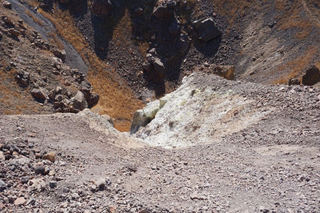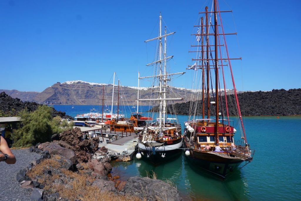 Volvemos Fira y comemos en el restaurante Mama Mía una greek salad y souvlaki chicken. Posteriormente nos dirigimos al Puerto Viejo de Fira. Si el puerto de Oia nos ha parecido que tiene muchas escaleras, las del puerto de Fira son infinitas. A las 14:00 cogemos el barco de la excursión que reservamos ayer. Nos lleva primero a darnos un baño en aguas termales de color barro. En realidad no está muy caliente, pero si tiene oxido el agua y nos queda la piel amarillenta y el bikini – bañador tambien. Después de media hora de baño a nuestro aire volvemos a subir al barco. La Isla de Satorini es el borde de un crater de un volcán y la caldera esta bajo el mar. En nuestro viaje en barco vamos navegando por la caldera. Paramos en uno de los islotes que está en medio de la caldera y que es muy volcanico. Está deshabitado. Damos un paseo por allí y vemos la zona donde se pueden ver las fumarolas que indican que este volcan continua activo. En total nos dejan una hora libre para explorar el islote. Para las 16:40 estamos en el puerto de Fira. La subida por las escaleras es cañera asi que optamos por subir en cable car por 6€ persona.