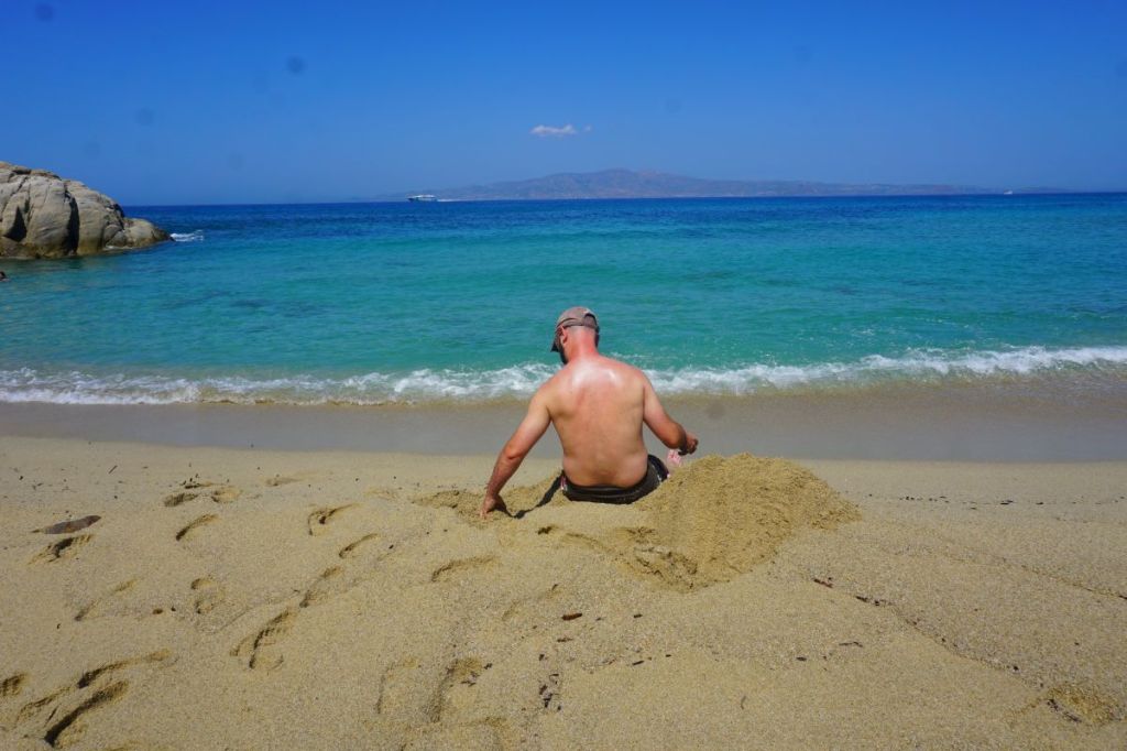 Estamos un rato tomando el sol pero no se podía aguantar de calor. Nos tomamos unas birras en la terraza de un chiringuito y decidimos irnos a la playa de Agios Sostis que ayer nos gustó mucho. Volvimos a estar muy a gusto y disfrutamos de nuestro último día de playa en Mykonos.