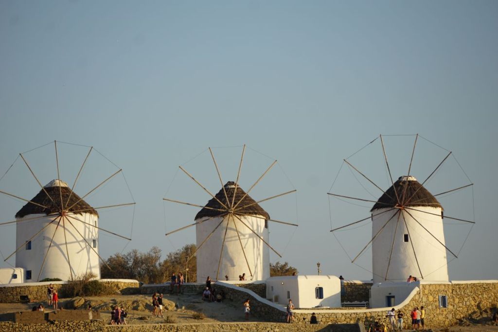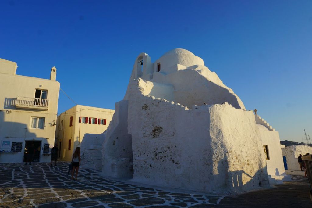 Dejamos las cosas y nos vamos a Chora, la capital de la isla. Dejamos el coche en un párking free y vemos los molinos, Little Venecia y callejeamos por la ciudad. Calles empedradas estrechas con escaleras y puertas y ventanas de colores. En Little Venecia nos tomamos unos cocktails mientras disfrutabamos de una puesta de sol espectacular. Vimos tambien una iglesia típica de la zona. Para cenar nos decantamos por un restaurante que vimos recomendado en googlemaps. Era un sitio pequeño, con cocina casera: guisado de verduras que era el plato de la casa.