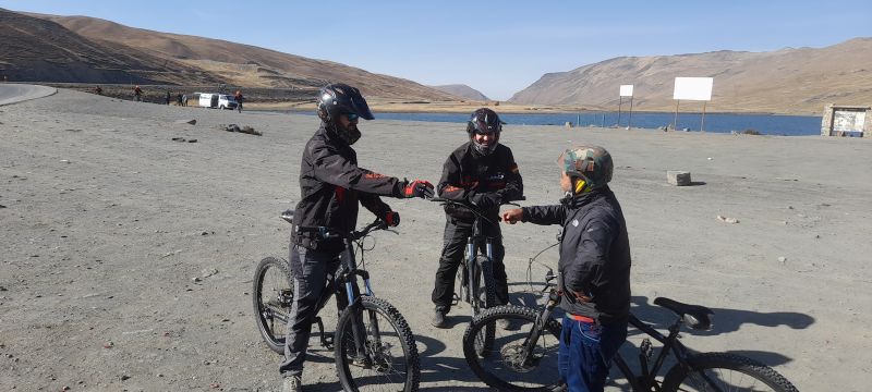 Antes de empezar, hacemos una ofrenda a la Pachamama, bebiendo alcohol de 96° (un sorbo te da calor). Tras el ritual empezamos el descenso. Es un puerto con bastante pendiente, pero la carretera está perfectamente asfaltada, es muy ancha y apenas tiene tráfico. Vamos haciendo paradas cada 5 o 10 kilómetros y en cada parada Luis nos cuenta cosas de la carretera de la muerte. Todo el rato Genaro viene detrás, es el coche escoba!