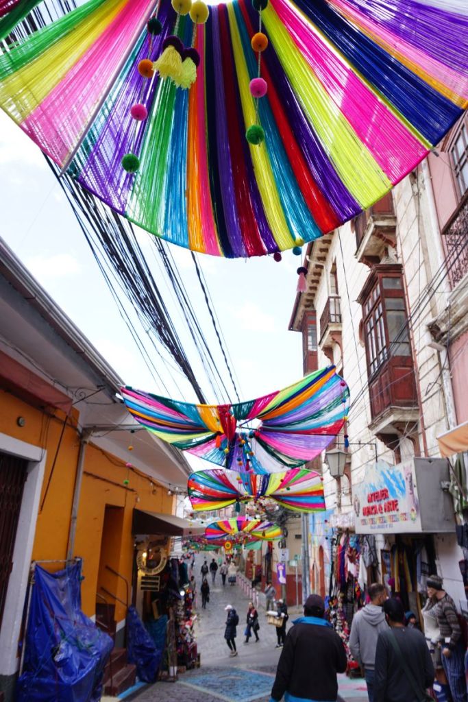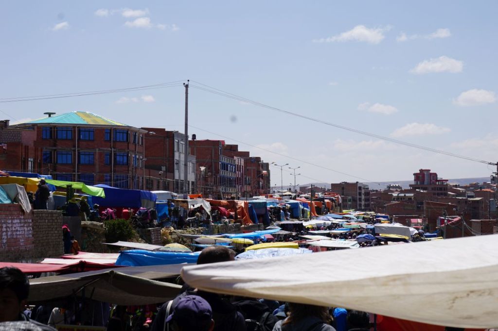 Bajamos de regreso al hotel y pasamos nuevamente por la calle Jaén. Ha abierto alguna cosa, pero sigue vacía. En el hotel cogemos ropa de abrigo ya que vamos a subir a la zona del Alto. Los domingos y martes hay mercado en esa zona y queremos visitarlo. Subimos en la línea de teleférico roja. Es una pasada lo grande que es el mercado, al parecer es uno de los más grandes de América Latina, y diría que ocupa el espacio de una pequeña ciudad. Hay muchos puestos callejeros de comida, pero nos decantamos por el Restaurante Los Cocos para comer, que está en pleno centro de mercado. Comemos Milanesa de pollo que está muy buena y nos sale muy barato. Nos gusta mucho el sitio porque es muy de locales, pero tenemos mala suerte, ya que nos roban una bolsa que teníamos colgada de una silla que contenía un abrigo de plumas. Nada que no pase en cualquier mercadillo de cualquier ciudad. Para salir del paso compramos otro abrigo en el mercado, ya que en cuanto se va el sol baja bastante la temperatura.
