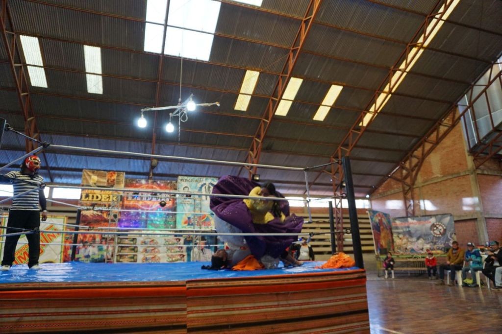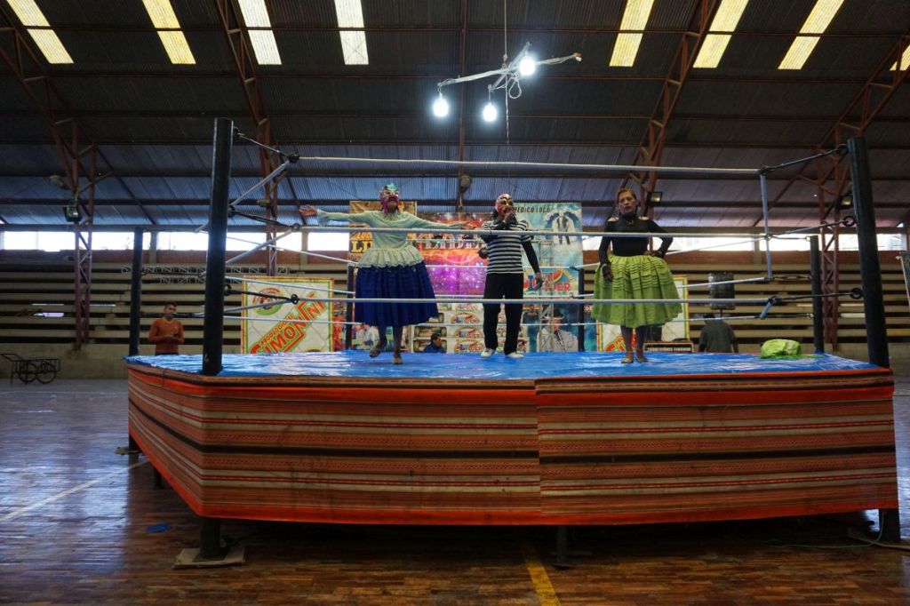 Nos cansamos del mercado y cogimos la línea gris del teleférico para ir al espectáculo de lucha libre de cholitas: Cholitas Wrestling. Está curioso de ver el espectáculo y es tipo comedia/ parodia. Se había perdido la tradición de la lucha libre y lo han retomado las Cholitas para reivindicar que las mujeres también pueden hacer lucha libre, ya que antes era exclusivo de hombres. Pagamos 50 bolívares por cada entrada. Los hoteles te ofrecen esa misma entrada con transporte por más dinero, pero habiendo teleférico no merece la pena pagar más. Nos vamos antes de terminar el último combate porque nos estábamos quedando fríos y al final se nos hizo un poco largo.