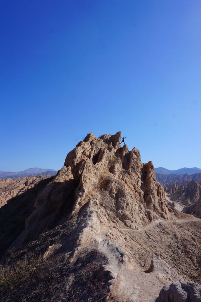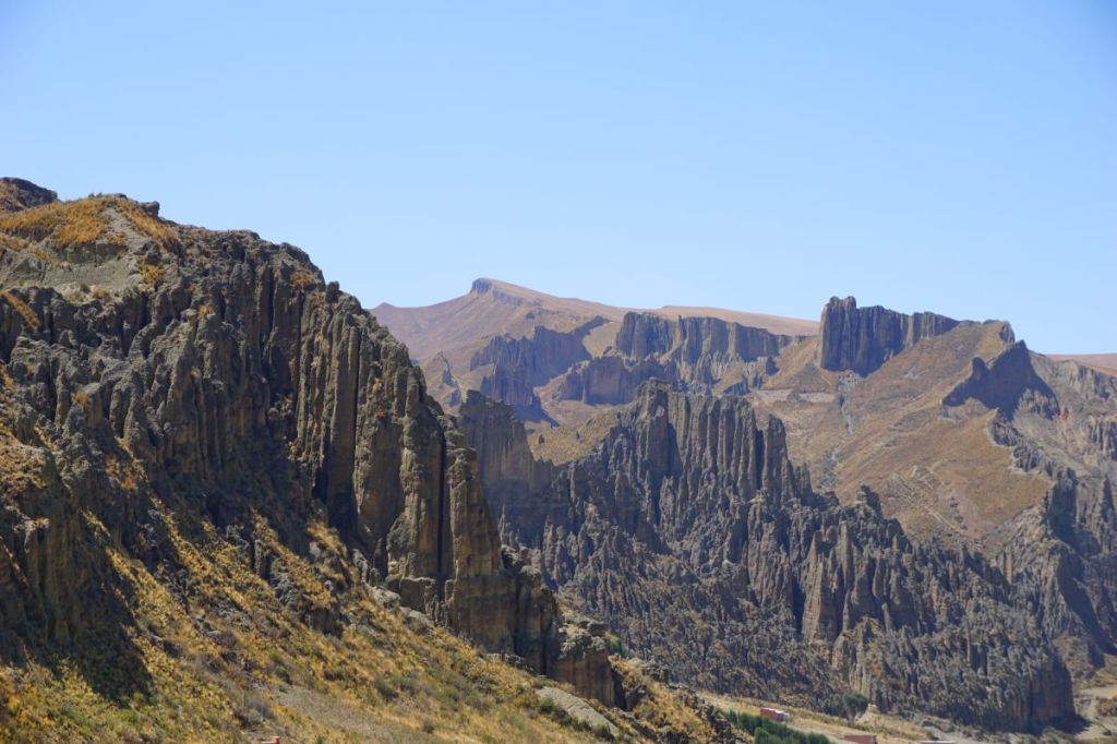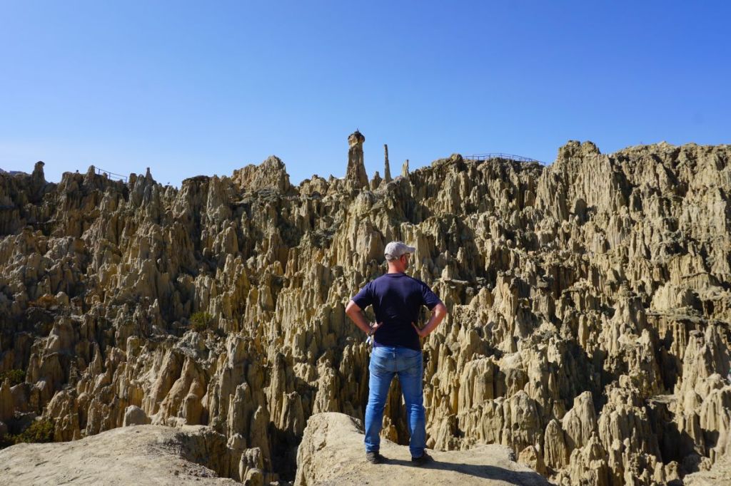 Primero visitamos el Valle de las Ánimas, que es de acceso público y tiene muy buenas vistas de la Cima del Illimani, la segunda más alta de Bolivia con 6.460 metros. Damos un paseo por ahí y luego vamos al Valle de la Luna, que se dice que el nombre se lo dio el astronauta Neil Armstrong cuando lo vio. En este sitio hay que pagar 15 bolívares y haces un recorrido de una hora entre las formaciones rocosas. Me recuerda a las Bardenas reales de Navarra.