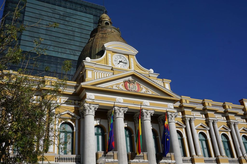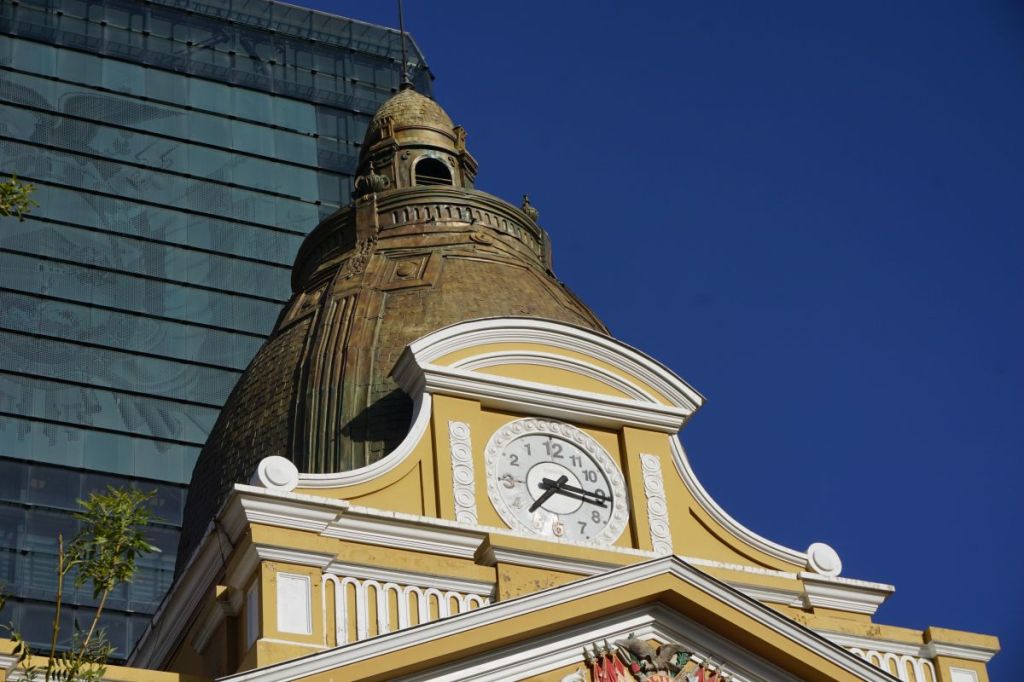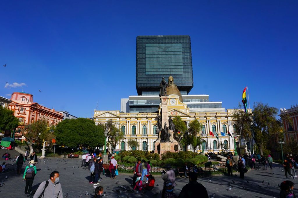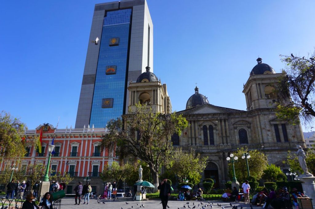 De aquí ya regresamos para La Paz y le pedimos al taxista que nos pare en la Plaza Murillo para que el amigo que ha llegado hoy vea un poco el centro de la ciudad. En esta plaza está el ayuntamiento, ayer no nos fijamos bien, pero hoy vemos que tiene 3 banderas y preguntamos qué significan a un lugareño, la que está en el medio es la de República de Bolivia, una con diferentes colores es la que representa el estado plurinacional de Bolivia llamada Wiphala y la otra azul es la reivindicación marítima de Bolivia, que en su día tuvo salida al mar, pero esa parte del territorio se lo robó Chile. Además, vemos que el reloj va al revés y nos explican que se hizo así para llevar la contraria a la colonia.