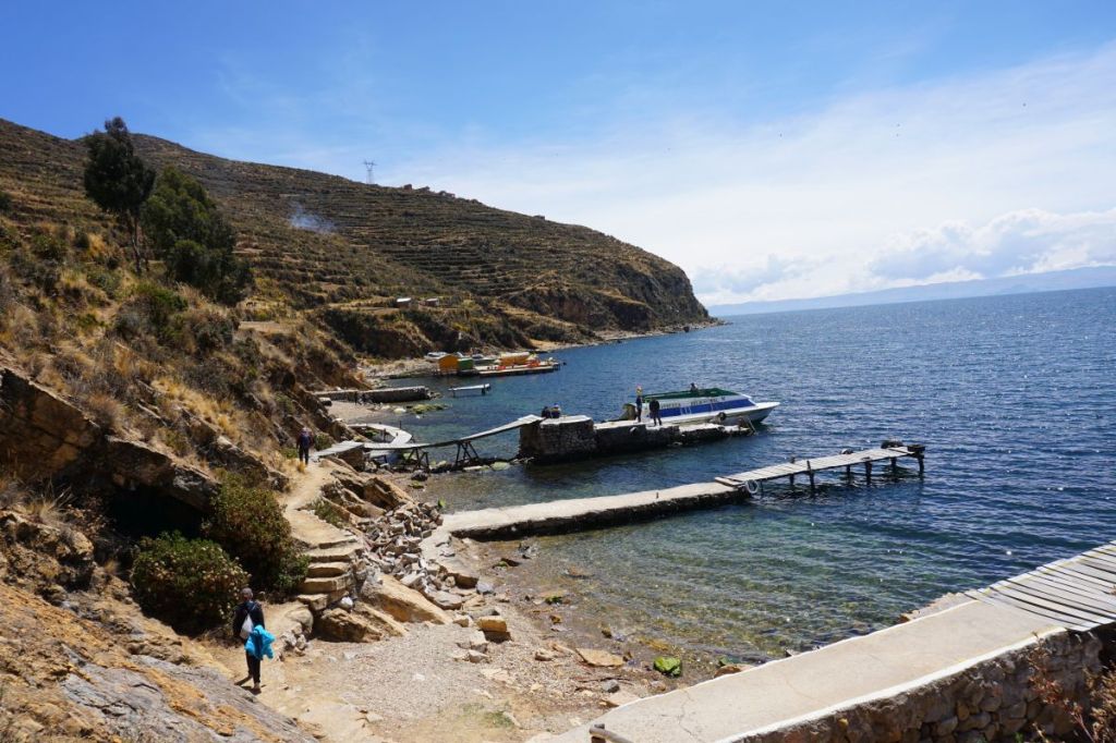 El trayecto dura más de una hora porque es bastante lento el barco. Una vez en la isla damos un paseo de hora y media con nuestro guía Valerio. Él nació allí aunque ahora vive en La Paz. En la isla viven 2000 personas divididas en 3 poblaciones. Hay varios hoteles para el turismo. No hay carreteras dentro de la isla y se mueven andando o en burro. Solo hay un centro sanitario para toda la isla y tienen un colegio hasta bachillerato. Tras una cuesta de escalones vemos la Fuente de la Juventud y bebemos de ella, a ver si se nos pega algo! Se sigue subiendo un poco más y luego ya es crestear y bajar al otro embarcadero desde el que volvemos a coger el barco para regresar a Copacabana.