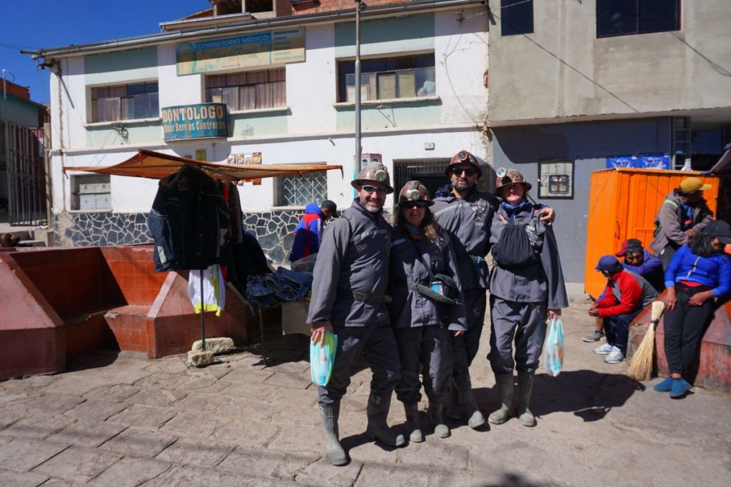 Desayuno buffet en el hotel. A las 9:00 vienen a buscarnos de la agencia para la visita a las minas. Hemos pagado 120 bolívares. Viene con nosotros también una alemana. Primero nos llevan a una casa a cambiarnos de ropa, nos ponemos una chaqueta, un pantalón, botas y un casco con luz. Después vamos al mercado minero y cada uno compra 10 bolívares en productos para los mineros como refrescos, hoja de coca y alcohol. Nuestro guía José nos enseña cómo mascar la coca y como es la dinamita que usan en la mina.