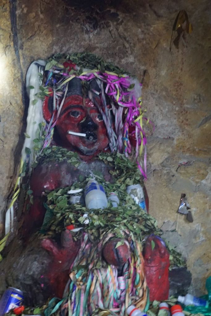 Entramos en la mina, cuando viene una vagoneta hay que echarse a un lado. En algunas zonas hay barro por las filtraciones de agua de lluvia. Tras adentrarnos unos metros a la mina, cogemos un desvío para saludar al Tío. La Pachamama es la madre Tierra y el Tío inicialmente era el diablo cristiano que introdujeron en las minas para atemorizar a los mineros. No obstante, las creencias indígenas dicen que un dios puede ser bueno y puede ser malo al mismo tiempo, y empezaron a venerarlo. Las esposas de los mineros no pueden entrar a la mina porque la Pachamama se pone celosa. Inicialmente al Tío se le llamaba Dios, pero en el quechua no existe la letra D y por eso se acabó llamándole Tío. Los mineros acuden a hacerle ofrendas para pedir una veta más grande y para que les proteja. Las ofrendas son hoja de coca, alcohol y cigarrillos. Nosotros hacemos nuestra ofrenda.