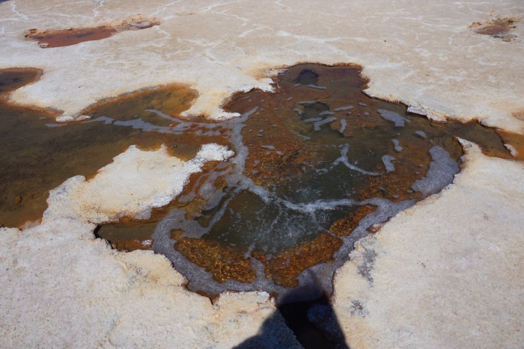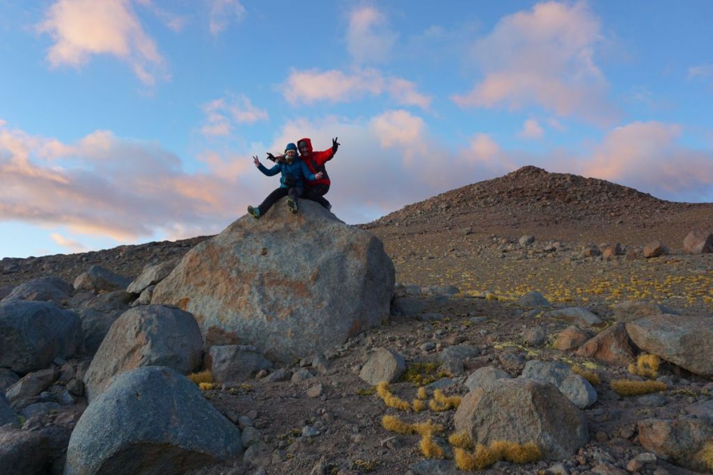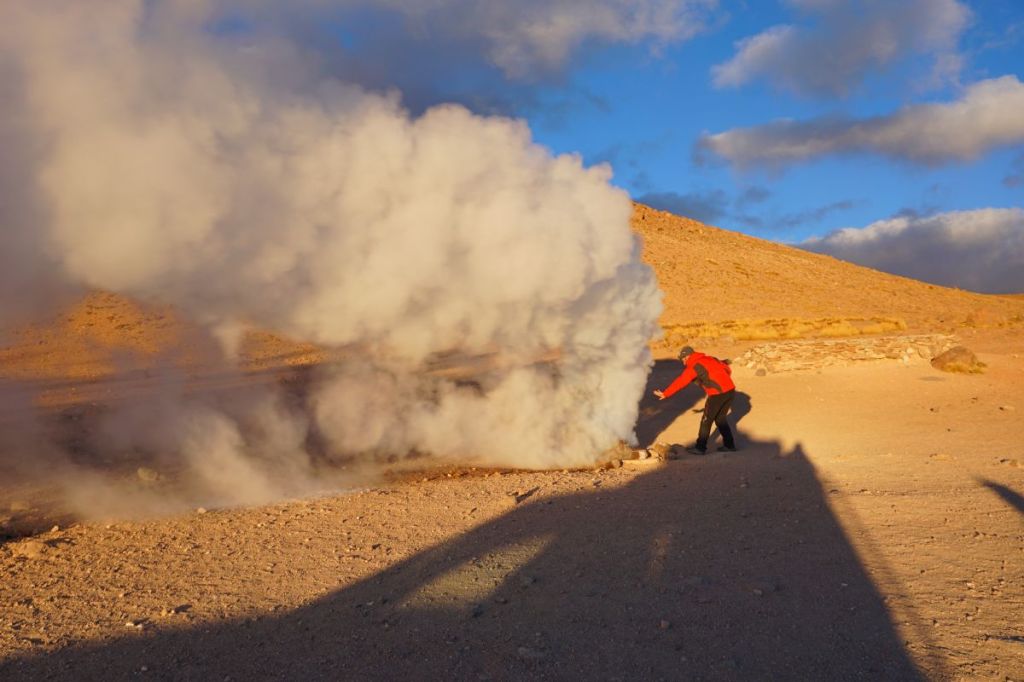 Hoy hay que madrugar un montón. A las 4:30 estamos ya desayunando, montamos todo en el coche y salimos. Por el camino llegamos a estar a 4.960 metros y le pedimos a Eddi parar, subimos hasta un montículo para estar a 5.000 metros, reto conseguido! Luego vamos a ver unos Geiseres. El aire que sale es caliente y con olor a azufre porque proviene de la lava volcánica.