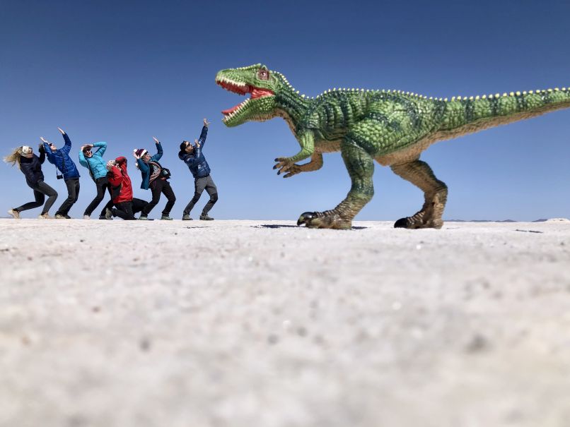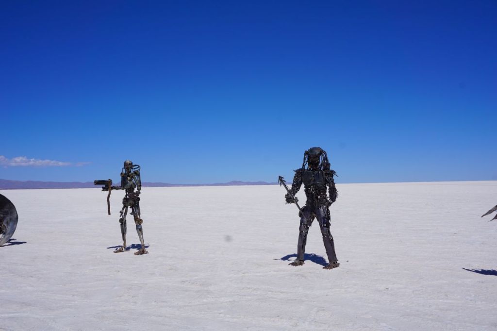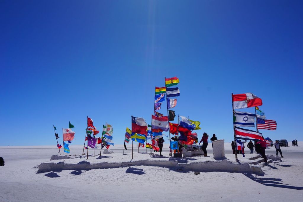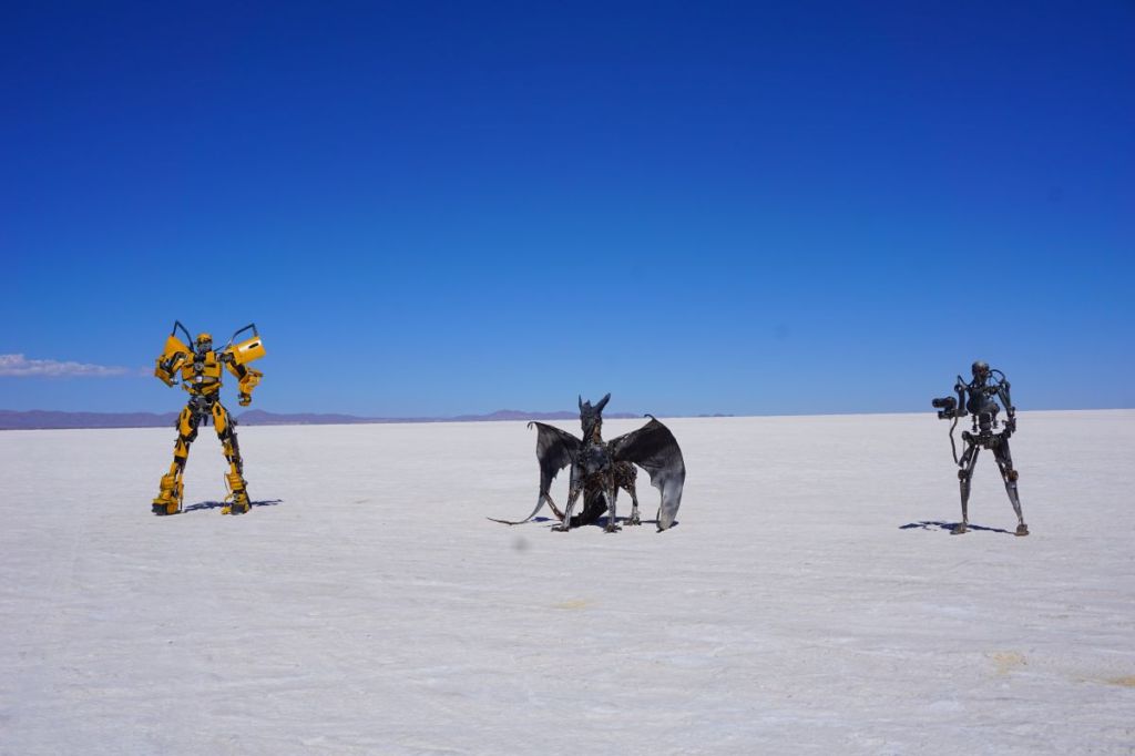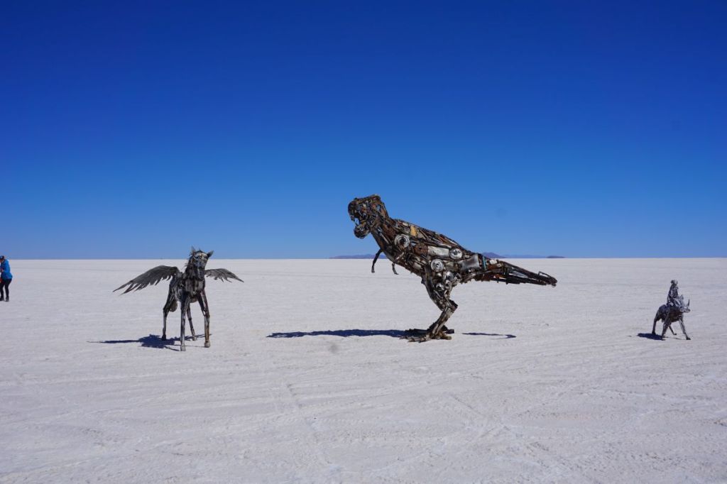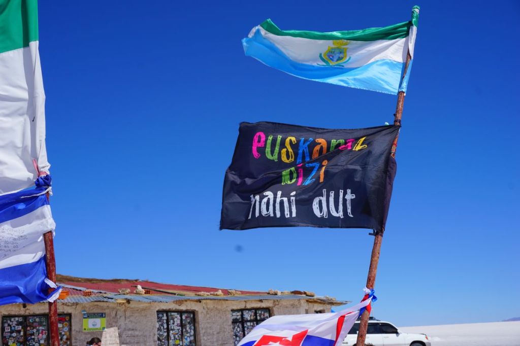 Nos adentramos en el salar, es enorme, es más extenso que todo Navarra. La siguiente parada es en el Monumento de Dakar y el museo de sal. Primero nos sacamos unas fotos divertidas que sacan unos bolivianos pagando cierto dinero. También hay unas esculturas metálicas de personajes famosos de películas muy chulas. Visitamos el museo, el suelo es de sal. Fuera está el Monumento de Dakar y una colección de banderas que ha ido poniendo la gente. No hay ikurriña pero si hay una de euskara bizi nahi. Nos deja estar un rato largo por este sitio.