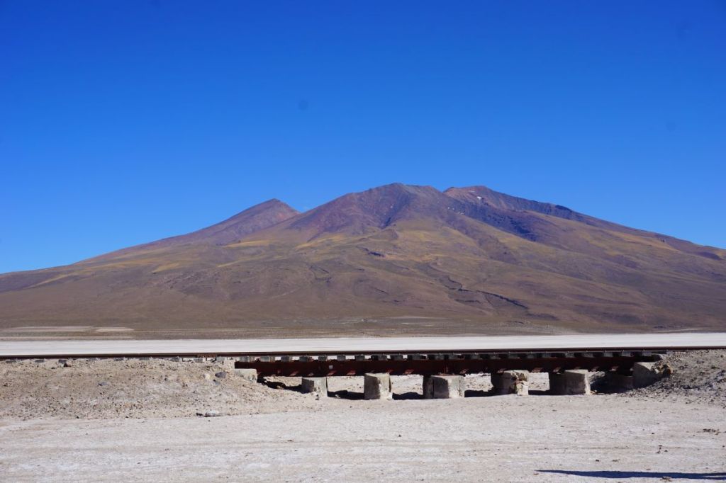 Nos levantamos a las 7:30 para desayunar a las 8:00 y salir a las 8:30. El desayuno es tipo continental. La primera parada de hoy es en el Mirador del Volcán Ollagüe, se ve genial, e incluso tiene una fumarola. Pasamos unas vías de tren donde paramos también a hacernos una fotos.Ya apenas pasan trenes por aquí.