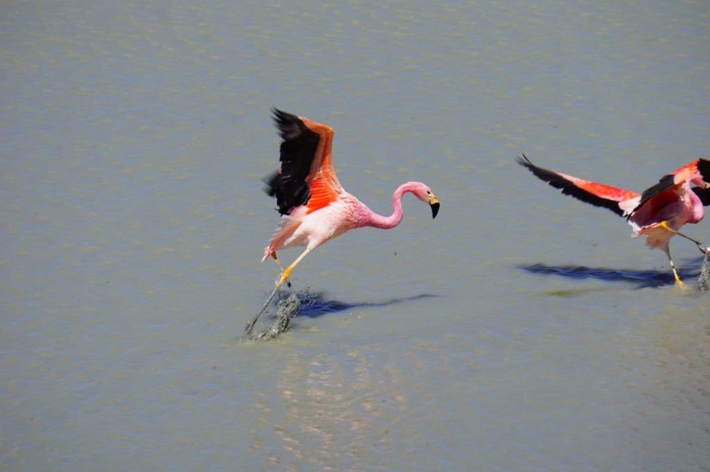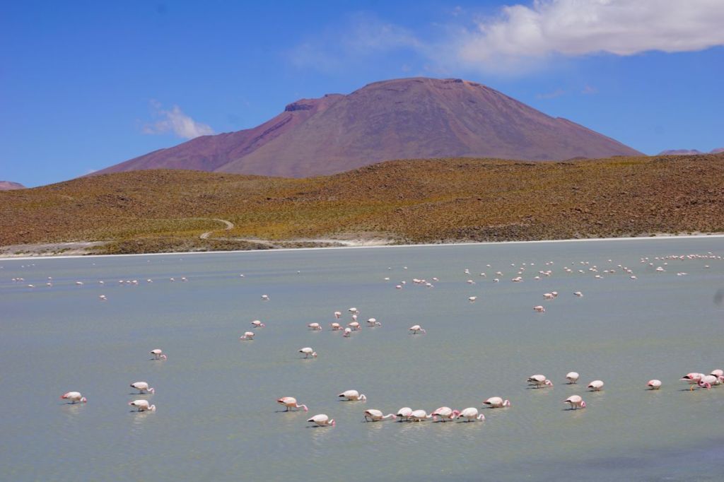 Luego visitamos varias lagunas. Empezamos por la Laguna Cañapa y la Laguna Hedionda, que se llama así porque huele un poco a azufre. En esta charca vemos un montón de flamencos. Eddi nos deja pasear un rato por aquí, mientras nos prepara la comida. Hoy hay pollo y pasta, está todo muy rico, y comemos con vistas a la laguna. Después de comer damos otro paseo mientras Eddie recoge.