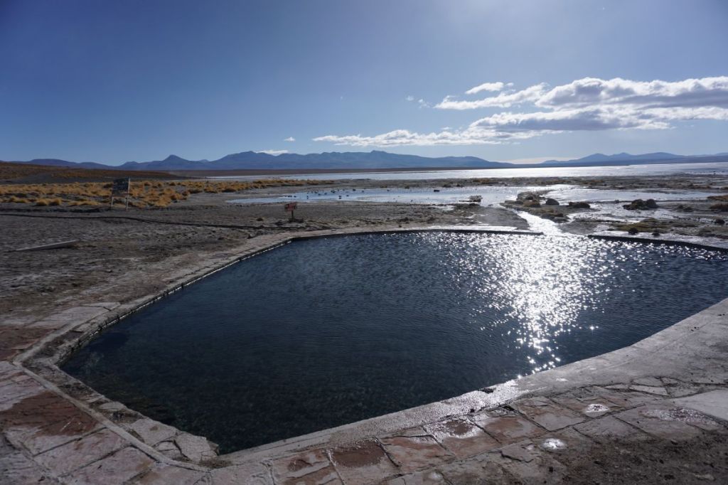 Luego vamos a unas Aguas Termales que están a 39 grados. Son las 8:00 de la mañana y hace un frío que pela, nos cambiamos en unos vestuarios que están al lado de piscina. Pasamos el mal trago hasta entrar al agua y luego es una maravilla. Estamos un buen rato en el agua. Nos viene de lujo porque estábamos congelados de cuando hemos subido a 5000 metros.