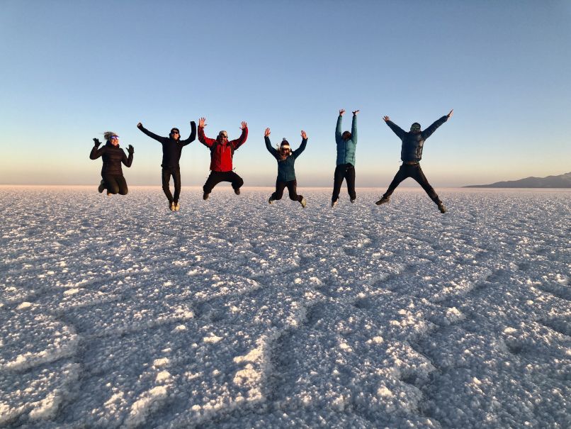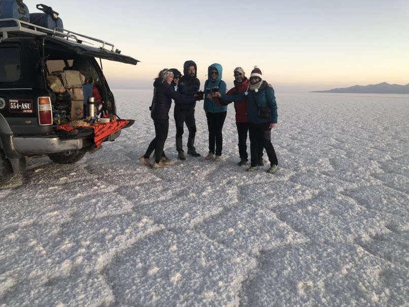 Continuamos por el salar y paramos para hacernos otra vez fotos divertidas, y Eddie nos prepara un aperitivo de patatas, cacahuate, vino y matecitos que disfrutamos mientras vemos el atardecer. Se empieza a levantar viento y hace frío que pela!