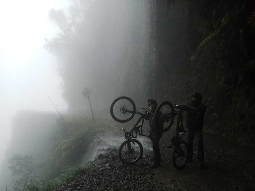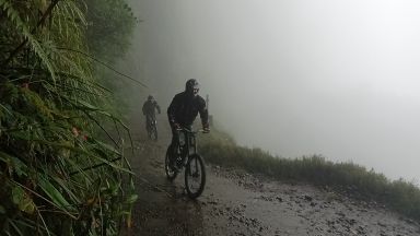 Tras una media hora más o menos, nos montamos en la furgoneta y nos lleva, ahora sí, al comienzo de la carretera de la muerte. Es una carretera que ya no está abierta al tráfico y solo la usan los turistas como nosotros. Es una carretera que tiene el asfalto totalmente estropeado pero es muy ancha para bajar en bici (hay que tener en cuenta que era una carretera de doble sentido por la que se cruzaban camiones y autobuses. De ahí los accidentes y de ahí el nombre). Vamos bajando con cuidado porque en esta zona el clima ha cambiado y hay mucha niebla y mucha humedad.