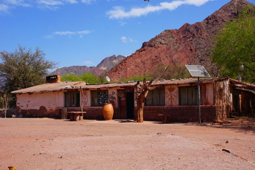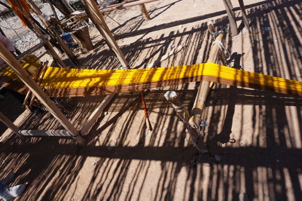 Después seguimos nuestro recorrido hasta Cafayate por carretera de ripio. Se estrecha en alguna zona pero se conduce bien, hay poco tráfico. Nos desviamos de N40 un tramo para pasar por el Camino de los Artesanos, donde se encuentras pequeñas viviendas donde principalmente se tejen mantas, ponchos, etc… Paramos en el primero, que tras ver los siguientes, vemos que es un acierto porque es el más auténtico. Nos enseñan cómo funcionan sus telares. Lo hacen con lana de llama, a veces con su propio color y otras veces las tiñen de colores. Un trabajo muy laborioso.