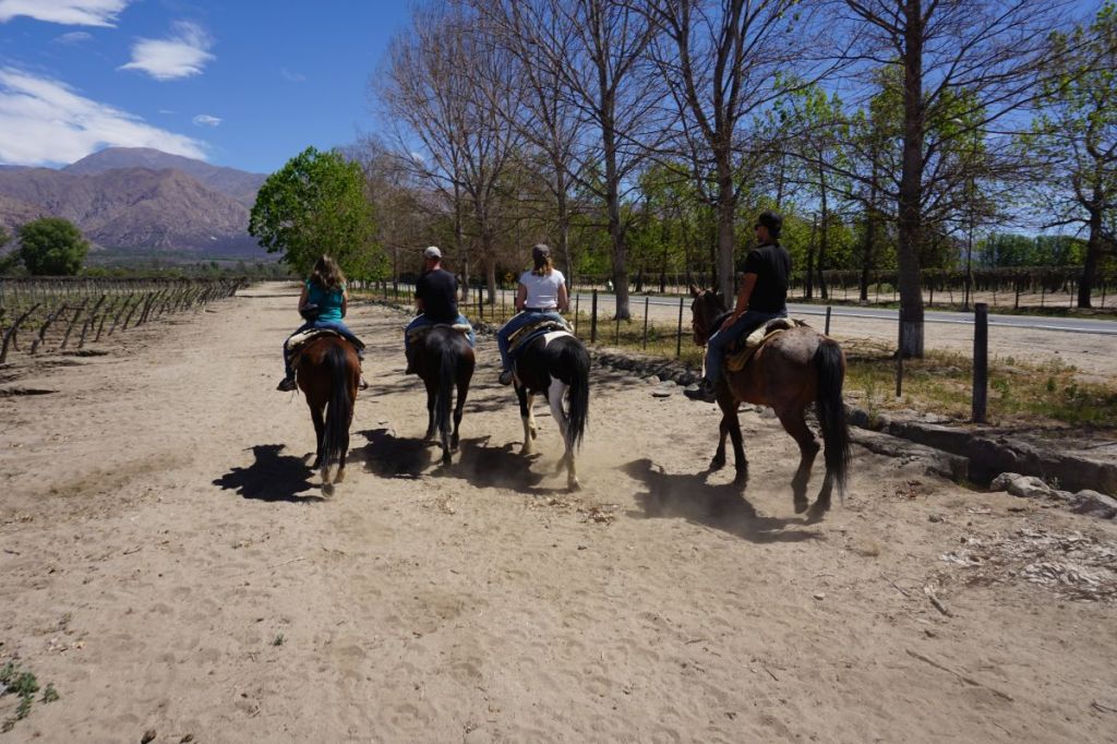 Tras la visita contratamos un paseo a caballo en el propio hotel de la Bodega. Por un paseo por los viñedos de una hora pagamos 2500 pesos por persona. Los caballos son muy manejables y lo pasamos muy bien. El mío se puso un poco al trote, aunque pude frenarle bien!