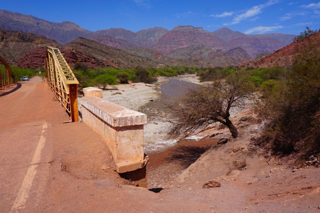 Luego llegamos hasta Salta, la bordeamos y vamos dirección Cachi por las Yungas. La primera parte del camino es carretera estrecha asfaltada y es todo bastante verde. Vemos una zona recreativa donde hay gente en un río e incluso se puede hacer kayak. Entramos pero hay que pagar por el vehículo y por persona y realmente sale caro para estar solo un rato. Además no hace demasiado calor como para hacer kayak. Continuamos y nos paramos en un pueblo un poco más adelante. Nos damos un paseo, vemos el río que ahora lleva poca agua y llegamos hasta un camping. Nos volvemos al coche, y como siempre tenemos un montón de perros que nos siguen.