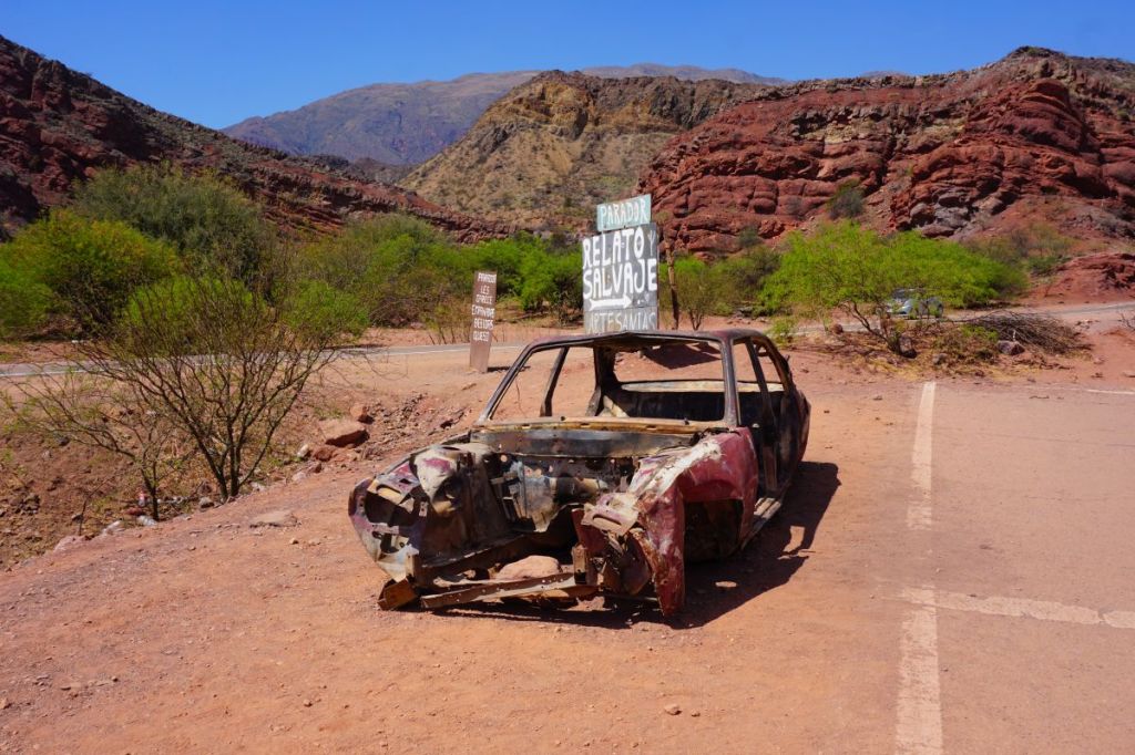 No llegamos a despedirnos de Jorge porque se marcha pronto, tiene un montón de kilómetros a casa. Desayunamos con Víctor. Nos despedimos y nos vamos a la estación a coger un bus a Jujuy, 550 pesos. Tardamos una hora aproximadamente. Nos paramos en la terminal nueva, antes hay otra parada en Jujuy pero es la que llaman la vieja. Nos está esperando la chica que nos alquila el coche. Le pagamos 200 € por 5 días y otros 200 de fianza. Se lo entregaremos en el aeropuerto. Es un Renault Sandero. Poco motor pero va bien.