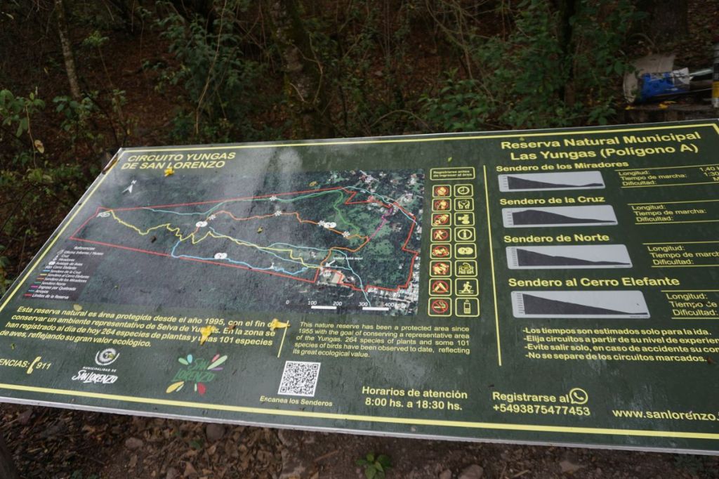 Primero vamos hasta una oficina de la municipalidad que nos han dicho en el hotel para conseguir la tarjeta «saeta bus» para poder bajar a la tarde a Salta a cambiar dinero. En San Lorenzo no hay sitios de cambio y no tenemos pesos. Se paga 300 pesos por la tarjeta y viene con 180 pesos, 4 viajes son unos 204 pesos así que la recargamos con 30 más. Nos da un mapa del lugar y nos vamos a la oficina de información de las Yungas de San Lorenzo.