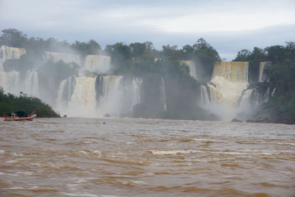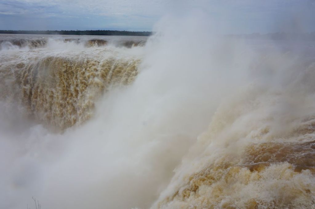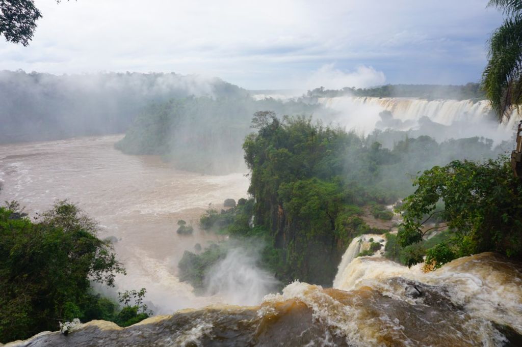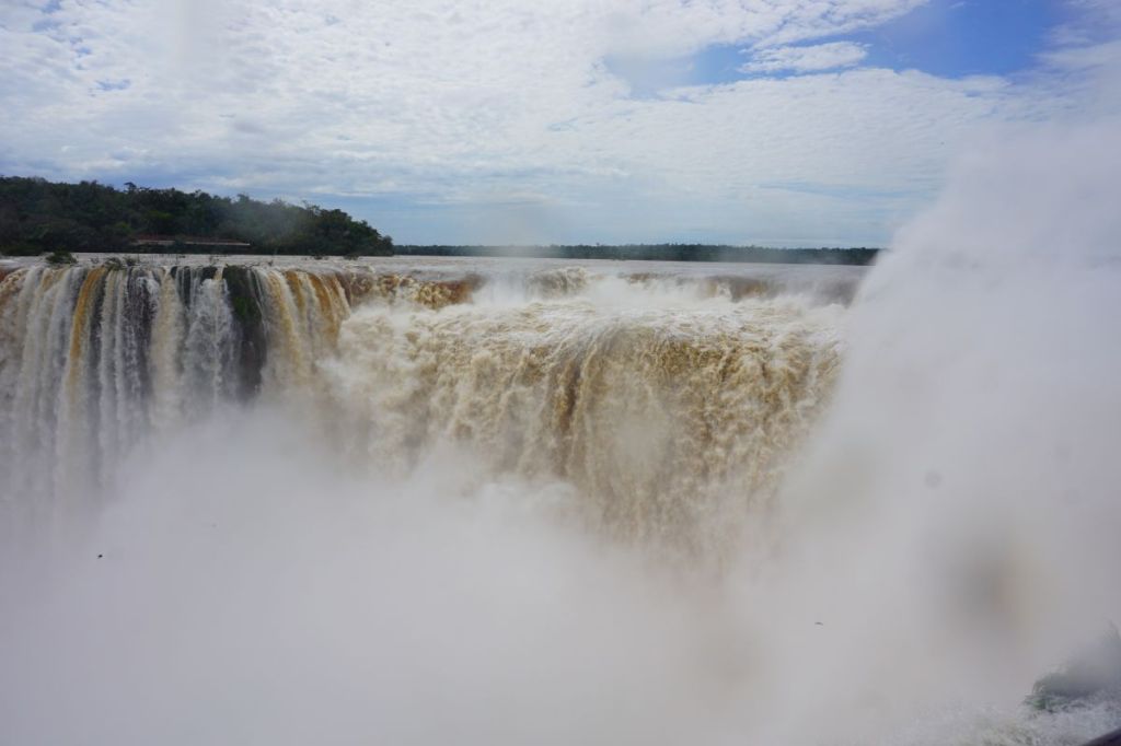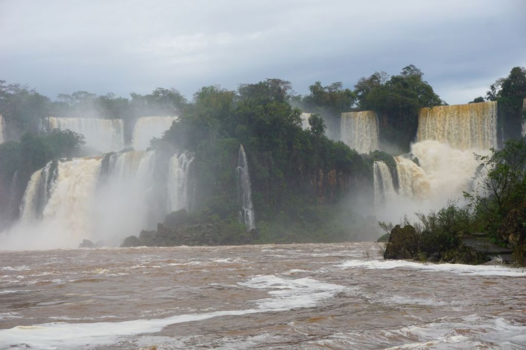 Se camina por unas pasarelas sobre el río hasta llegar a un mirador y ahí es la locura…cascadas inmensas con volúmenes de agua increíbles. Nos cuentan que este año en marzo había sequía y las cataratas estaban prácticamente sin agua, incluso no sé podía hacer la vista en barco porque estos no podían navegar por falta de caudal. Hemos tenido suerte porque en las últimas semanas ha llovido mucho y nos cuentan que en estos momentos están expulsando un caudal de 4.000 millones de metros cúbicos por minuto. Lo cual es una barbaridad! Nos quedamos totalmente empapados en el mirador. Nos dan un rato para estar allí y sobre las 11:40 estamos en el punto de encuentro para coger nuevamente el tren.