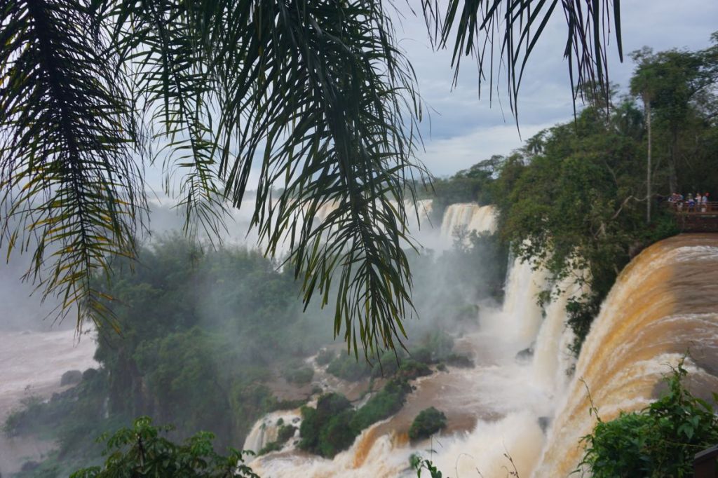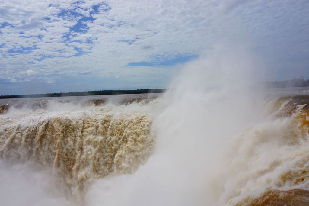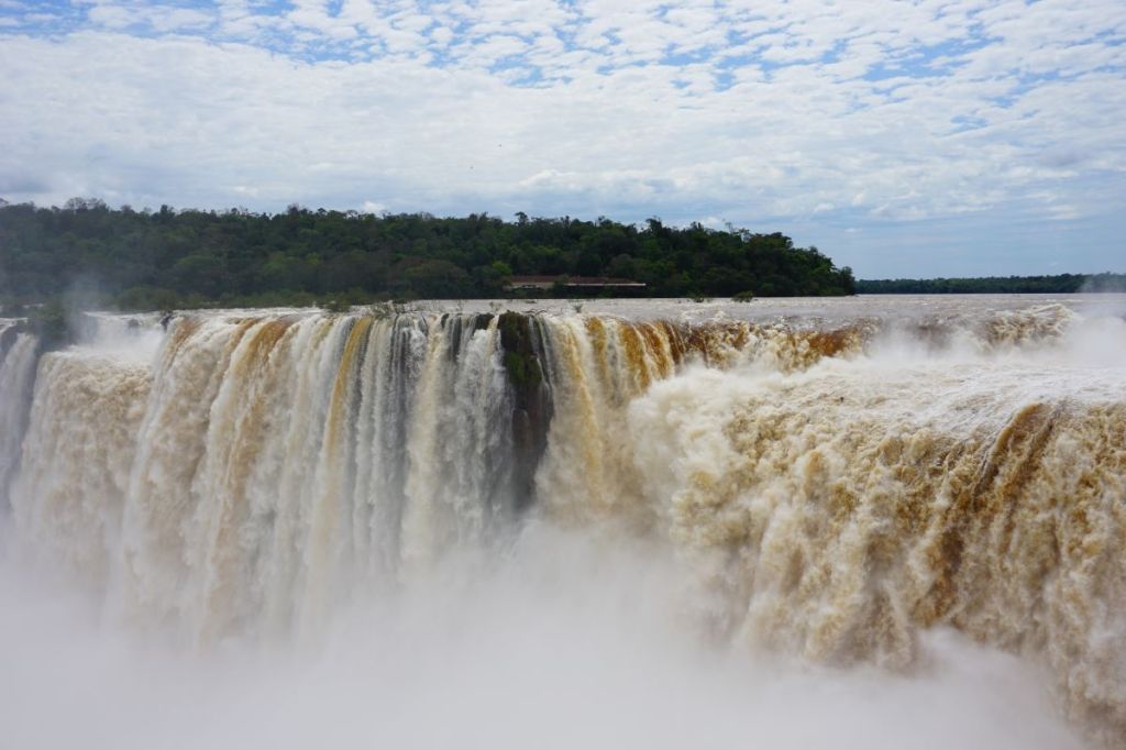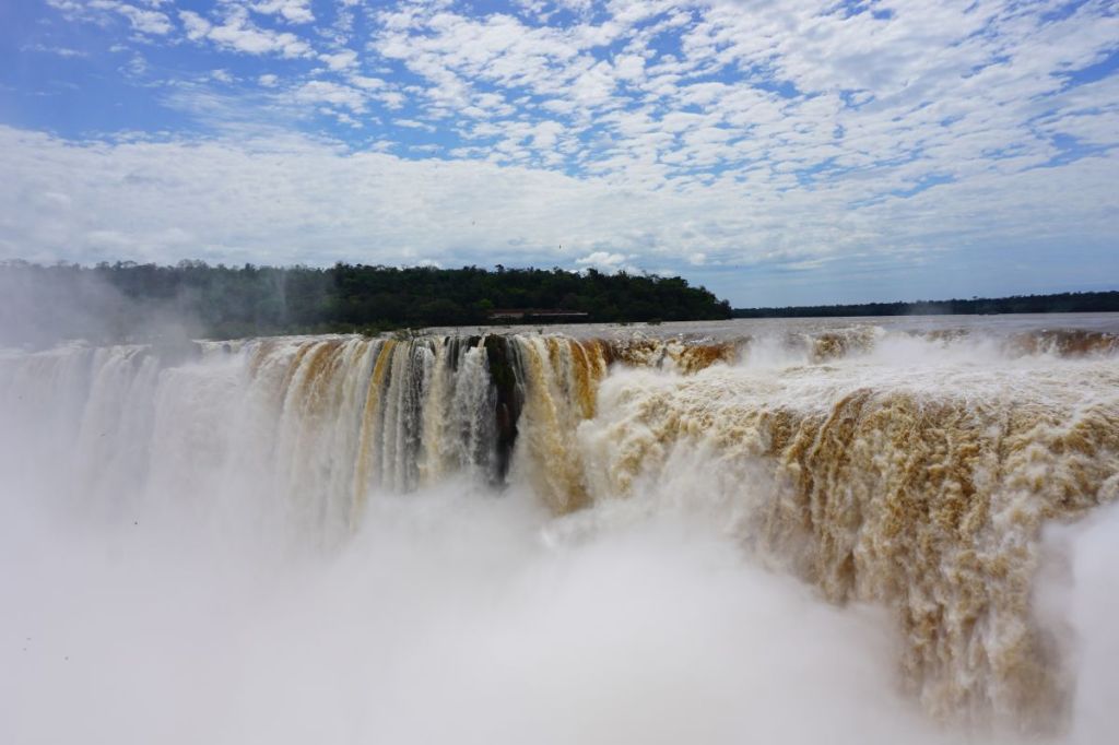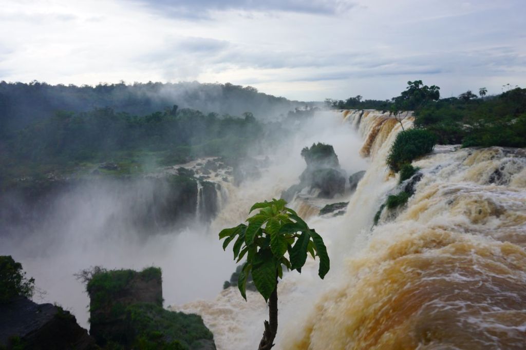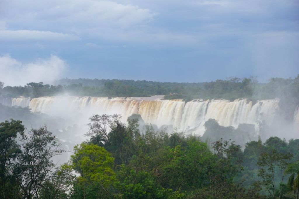 Se camina por unas pasarelas sobre el río hasta llegar a un mirador y ahí es la locura…cascadas inmensas con volúmenes de agua increíbles. Nos cuentan que este año en marzo había sequía y las cataratas estaban prácticamente sin agua, incluso no sé podía hacer la vista en barco porque estos no podían navegar por falta de caudal. Hemos tenido suerte porque en las últimas semanas ha llovido mucho y nos cuentan que en estos momentos están expulsando un caudal de 4.000 millones de metros cúbicos por minuto. Lo cual es una barbaridad! Nos quedamos totalmente empapados en el mirador. Nos dan un rato para estar allí y sobre las 11:40 estamos en el punto de encuentro para coger nuevamente el tren.