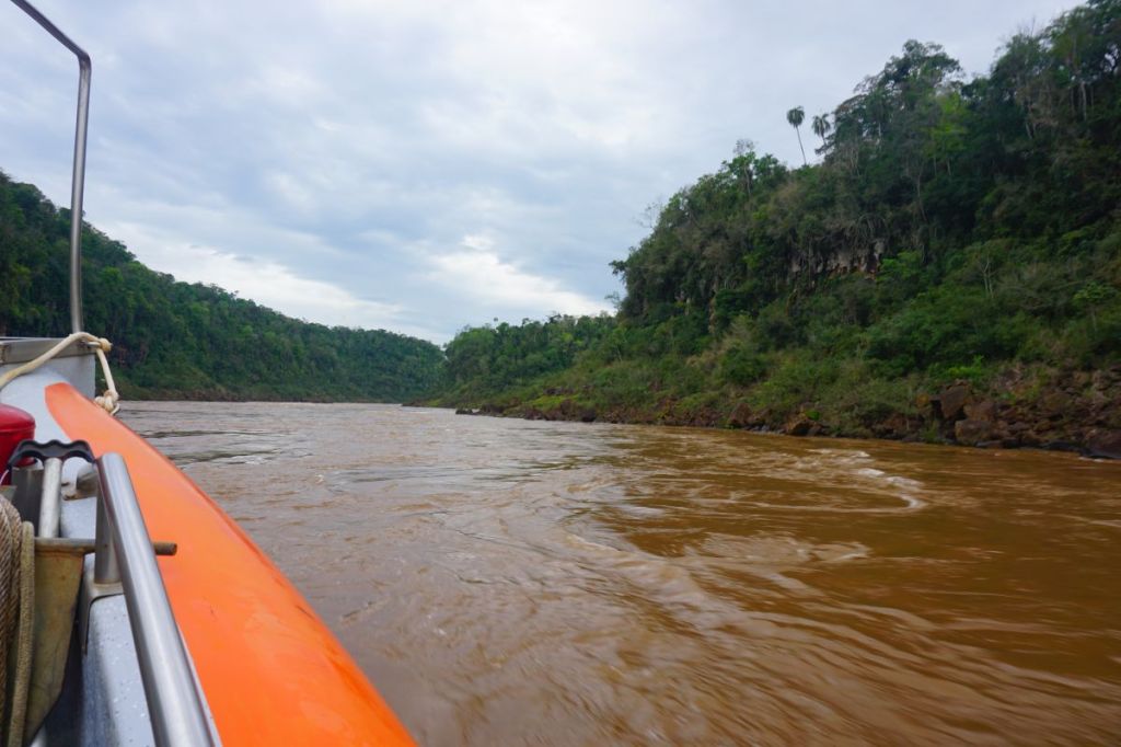 El tren tiene tres paradas, la de la entrada, la segunda que es la zona de comer y la tercera que es la Garganta del Diablo. Paramos en la segunda y tenemos un poco de tiempo para comer. Los que hemos optado por la excursión de la Gran Aventura nos montamos en unos buses descapotables. Nos llevan por la selva hasta el embarcadero. Hay que bajar unas escaleras y por el camino te dan una bolsa impermeable y el chaleco. En el paseo en barco puedes ir sacando fotos y también hay un señor que te graba con la GoPro, para luego poder venderte el video (merece mucho la pena comprarlo).