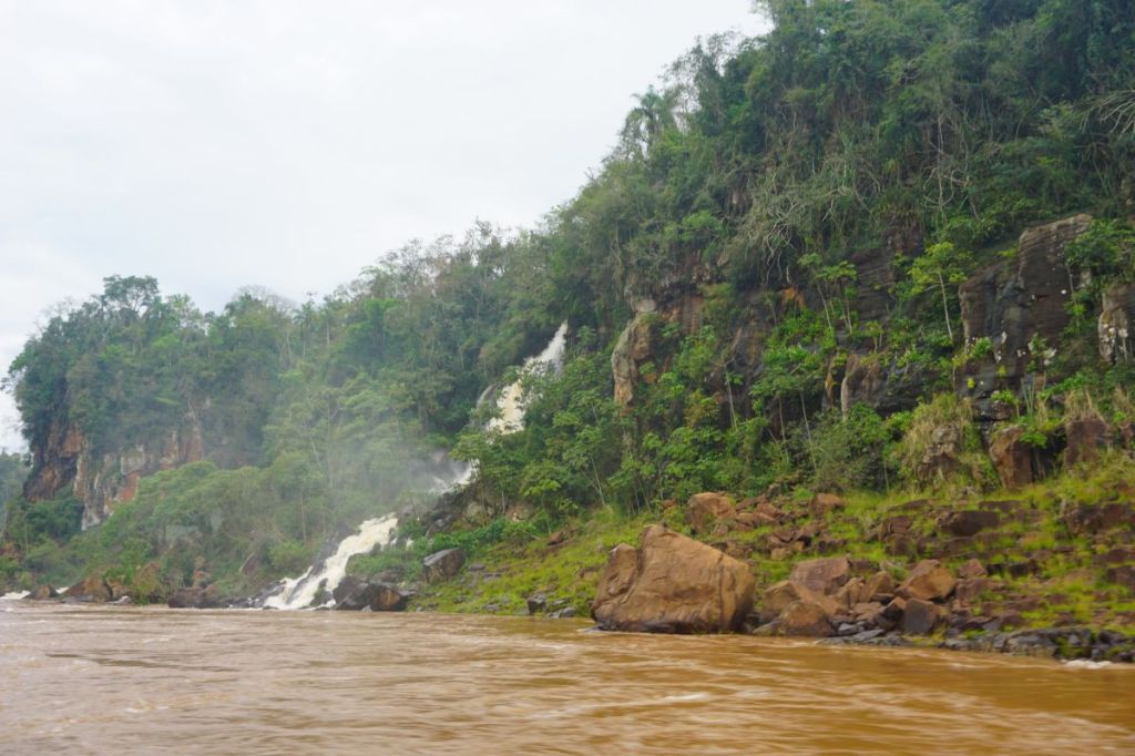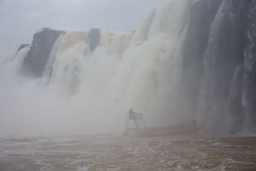 Primero se va por aguas tranquilas viendo el lado brasileño y argentino, luego se pasa a una zona de rápidos y por ultimo te acercan a las cataratas. Cuando te acercas a las cataratas te avisan para cerrar la bolsa impermeable, y guardar la cámara u otros objetos de valor. Yo llevo solo el bikini y guardamos todo lo demás, incluido el calzado. Primero nos acercan a una de ellas y nos mojados enteros. El agua no está muy fría pero se agradecería un poco más de calor fuera … y luego nos acercan a otra y está sí que es una pasada, nos cae una tromba de agua increíble. Hace hasta daño!