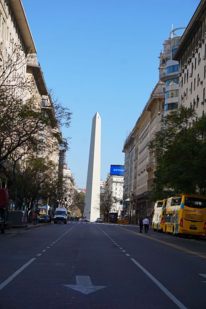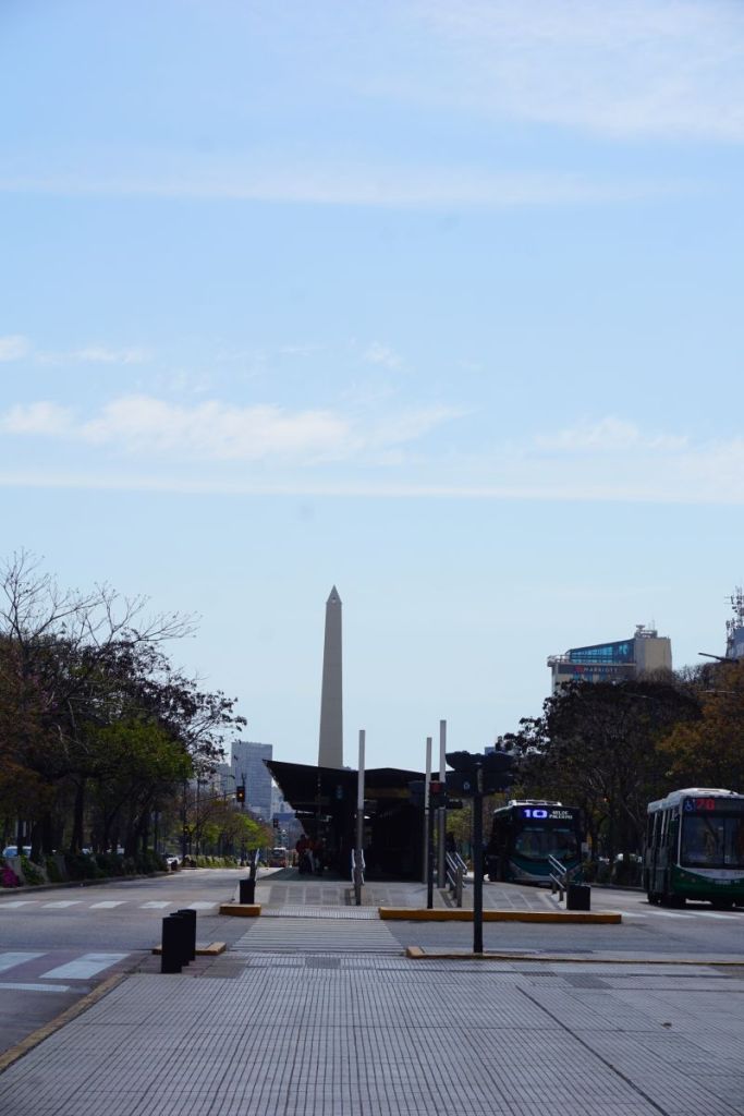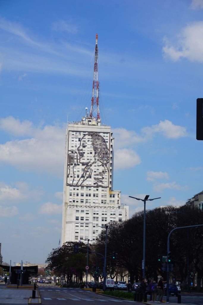Continuamos por la avenida de mayo y cruzamos la Avenida de 9 de julio, que durante algún tiempo fue la avenida más ancha del mundo. Desde aquí se ve un edificio que tiene el rostro de Eva Perón y el obelisco.