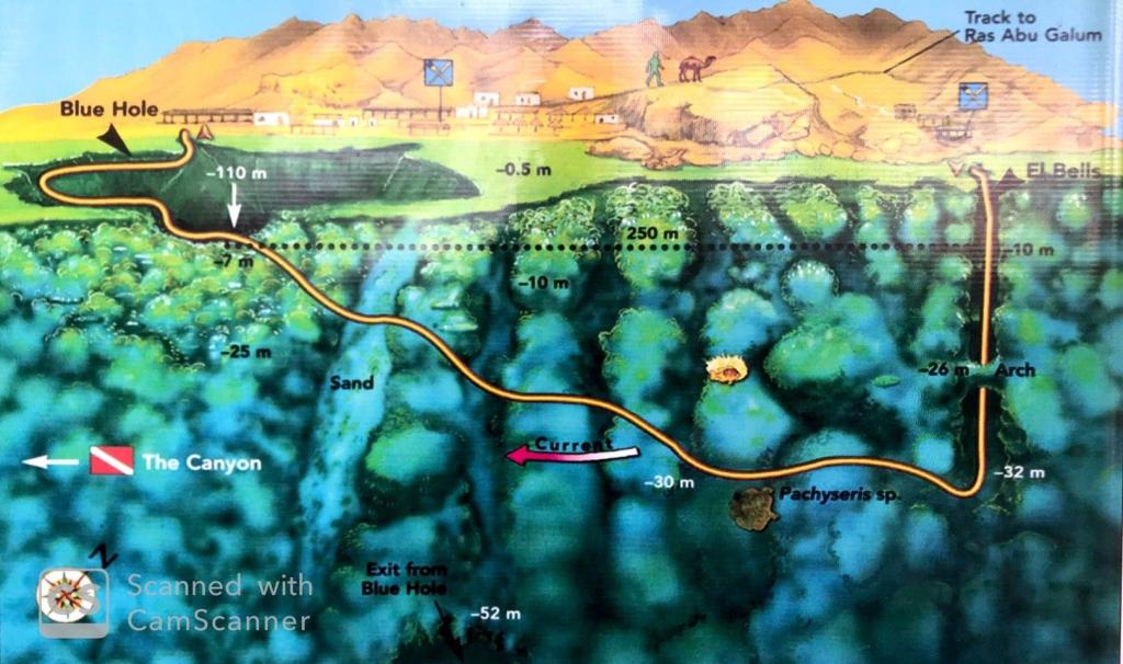 El Blue Hole de Dahab es un lugar mítico entre los buceadores, tanto por su espectacularidad, profundidad, dificultad técnica de la inmersión como por su facilidad de acceso al localizarse a pocos metros de la costa. Es además, tristemente famoso por el elevado número de accidentes de buceo fatales que se han producido tratando de alcanzar su fondo o cruzando el famoso «Arch», un arco submarino de unos 30 m de longitud que conecta el agujero azul con el mar abierto a una profundidad de unos 52 m.