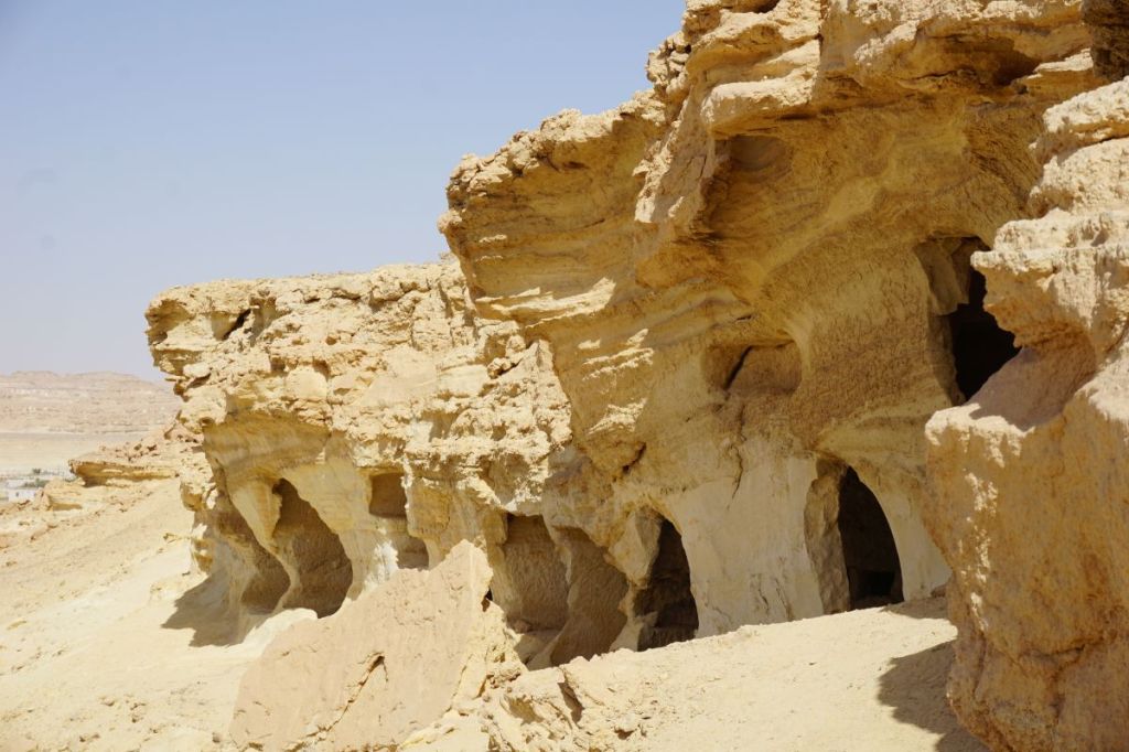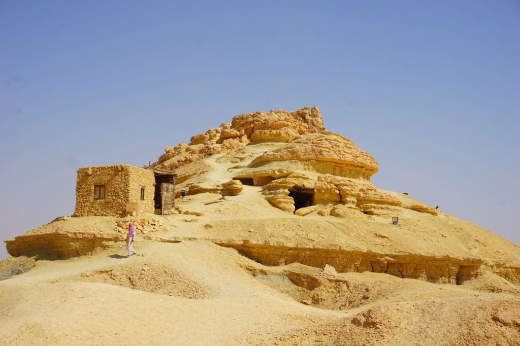 Desayunamos hoy algo diferente, una especie de hojaldre que está rico. A las 10 viene Mohamed a buscarnos, el guía del primer día en Siwa. Primero nos lleva a ver las Tumbas Bilad El-Roum que son de la epoca de los romanos y al Templo de Om obaidah. De este último queda poco del templo porque lo deshicieron piedra a piedra, y éstas fueron usadas para contruir el Banco, el colegio y otros edificios del pueblo.