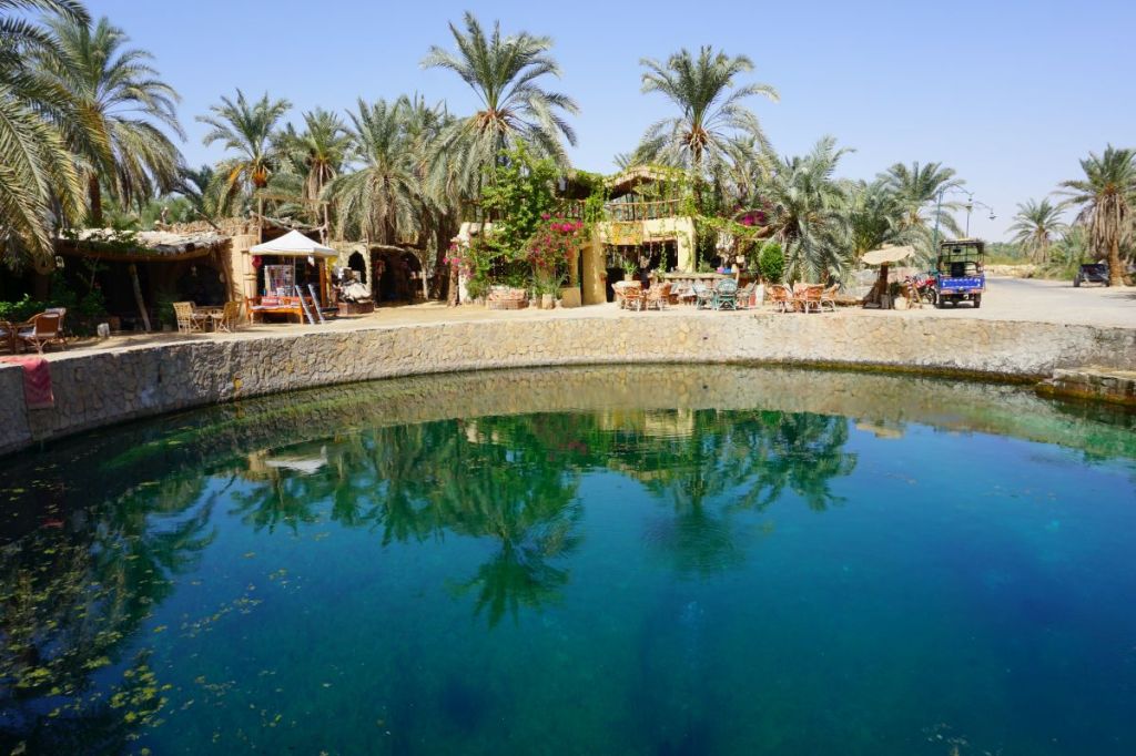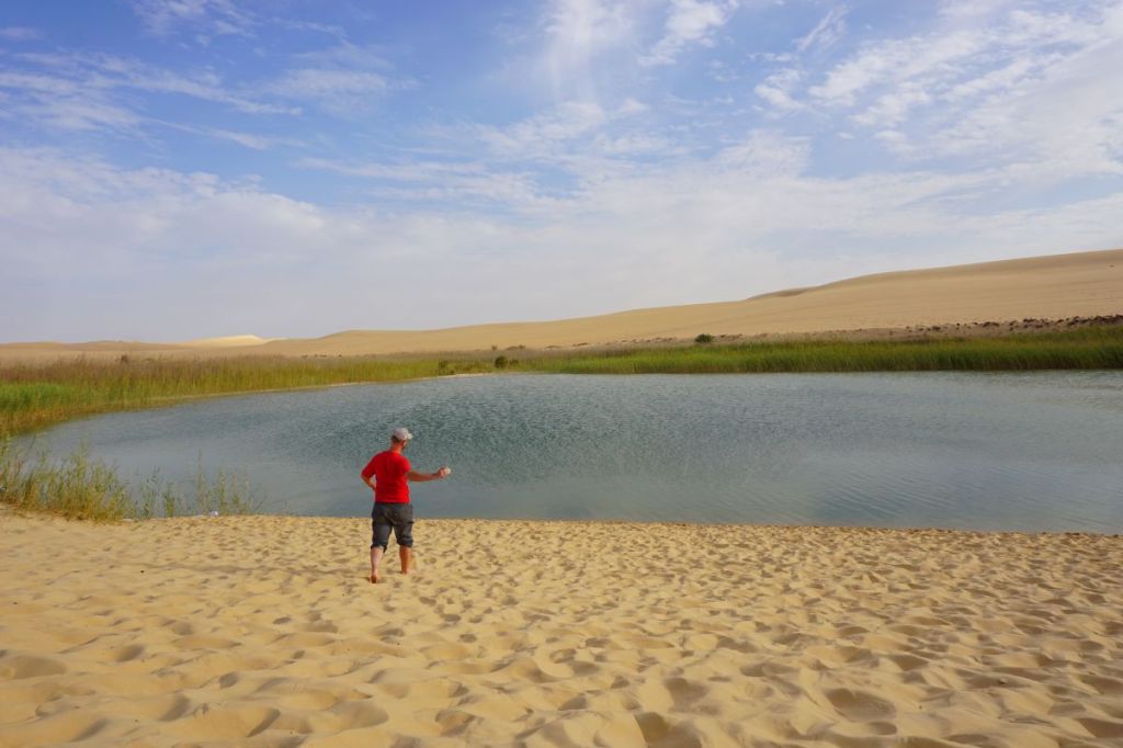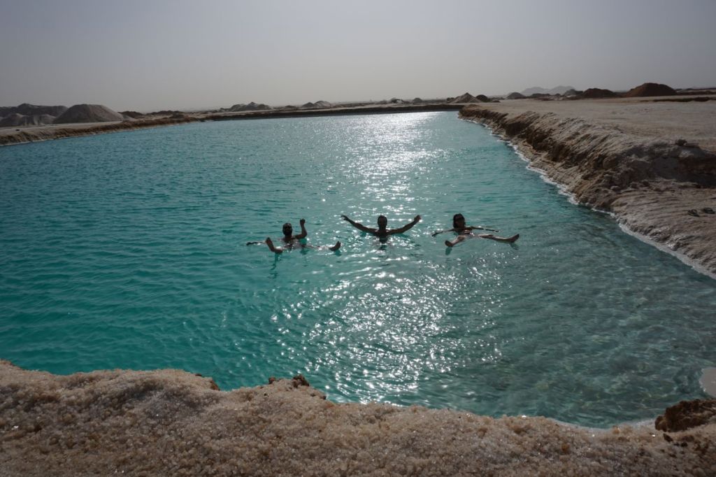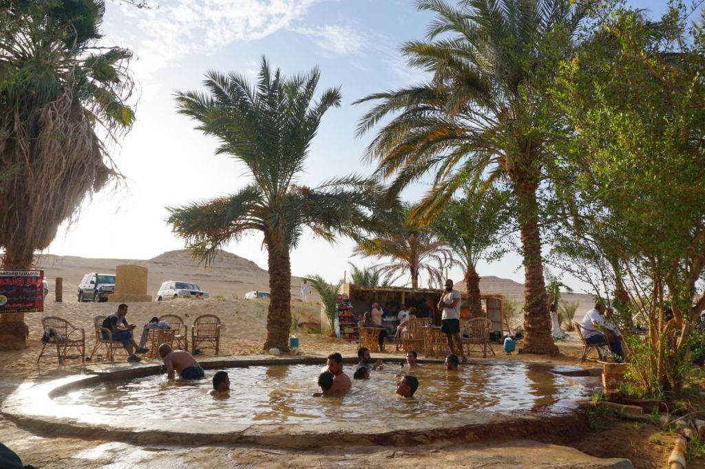 Nos preparamos para el 4×4. Nuestro conductor nuevamente se llama Mohamed y está muy loco, va a todo lo que da el 4×4 en las dunas y nos lo pasamos genial! Durante el trayecto va haciendo paradas en las dunas para que hagamos fotos. También vemos el Cold Lake, un mini oasis con una charca donde hacemos un descanso y luego entramos en el que Bir Wahed que es una poza de agua caliente en la que te puedes bañar. La poza huele a azufre y alrededor de la misma hay sillas y un bar. Nos damos un chapuzón y tomamos un té.
