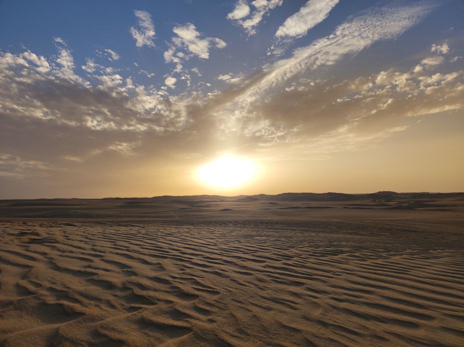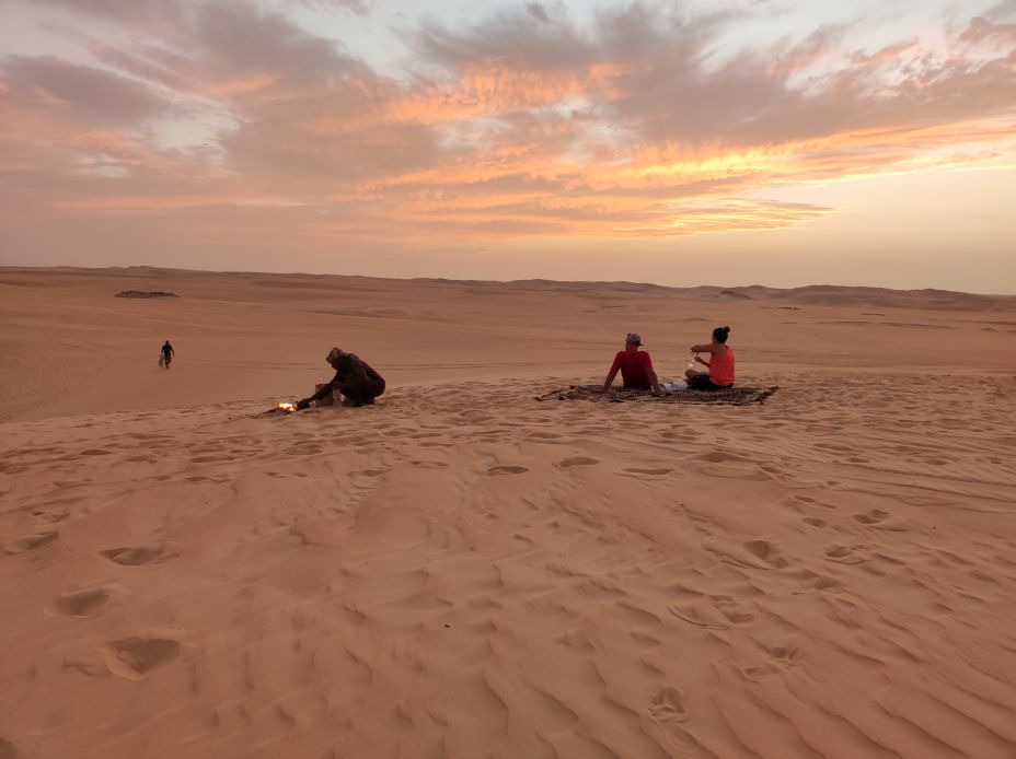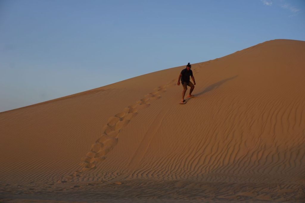 Continuamos haciendo el cabra por las dunas y la siguiente parada la hacemos en el Mar de Arena, que es una zona con fósiles marinos. Seguimos duneando y nos para en una duna donde hacemos sandboard y donde saca una alfombra para sentarnos y tomar el té y cacahuetes. Finalmente vemos la puesta de sol.