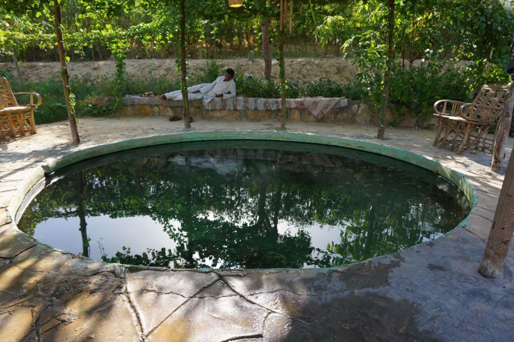 Mohamed nos lleva a cenar a un sitio al norte de la ciudad, donde hay un poza de agua caliente, pero no nos bañamos porque ya es de noche y ya hemos estado bastante a remojo. Comemos carne, arroz, sopa de verduras, verduras hechas y otras crudas. Un sitio muy tranquilo y agradable. Nos volvemos al hotel a dormir.