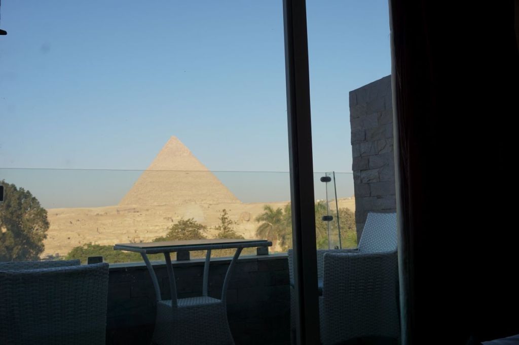 La cisterna del baño es bastante ruidosa y a la noche se oyen perros callejeros, pero levantarte con vistas a las piramides no tiene precio, desde luego es lo mejor del hotel. El desayuno es un poco raro, son varios platos con salsa de patata, de dos tipos de humus, patatas fritas, huevo duro, zumo y café.