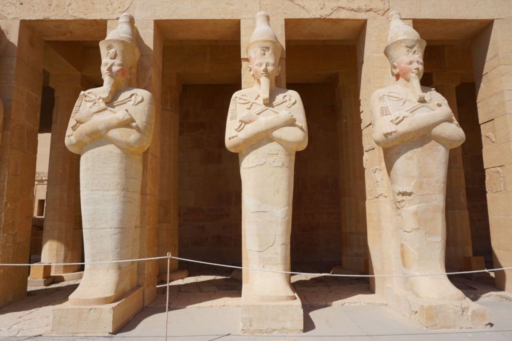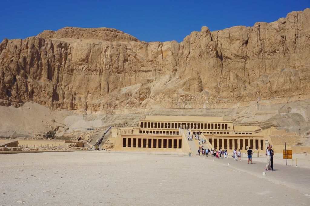 Luego vamos a ver el Templo de Hatshepsut. Era una mujer hija de faraón, hija de su primera mujer, pero al no ser hombre no le dejaron gobernar y pusieron a un hermano. No obstante, ella se casó con su semi hermano para poder gobernar. Se presenta así misma como faraón en masculino, creo que fue el primer icono feminista y LGTBI. Cuando su sobrino creció le quitó el reinado. No es tan espectacular como otras cosas que hemos visto pero la historia de esta mujer me encanta.