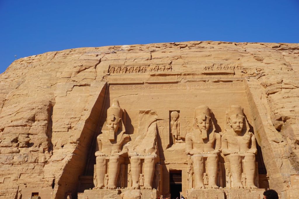 Nos levantamos a las 3:30 para salir en minivan a las 4:00 para el Templo de Abu Simbel. Llegamos a las 7:30, está lejos. Es muy impresionante, se ve el templo de Ramsés II y el de su mujer Nefertari. Están junto al Lago Nasser creado por la presa de Asuán. Cuando se hizo la presa el templo se iba a quedar sumergido y lo desplazaron piedra a piedra hasta su ubicación actual. La montaña también es artificial, aunque no se nota mucho, solo por los cortes en las piedras. Entramos en ambos templos, el de Nefertari es mucho más pequeño. Impresiona por estar tallado en piedra. Tras hacer la excursión nos enteramos de que hay gente que hace la visita en un día entero, es decir, van más tarde, lo ven casi solos, comen algo por allí y se quedan a ver el espectáculo de noche de luces y vuelven a Asuán, si lo hubiéramos sabido…