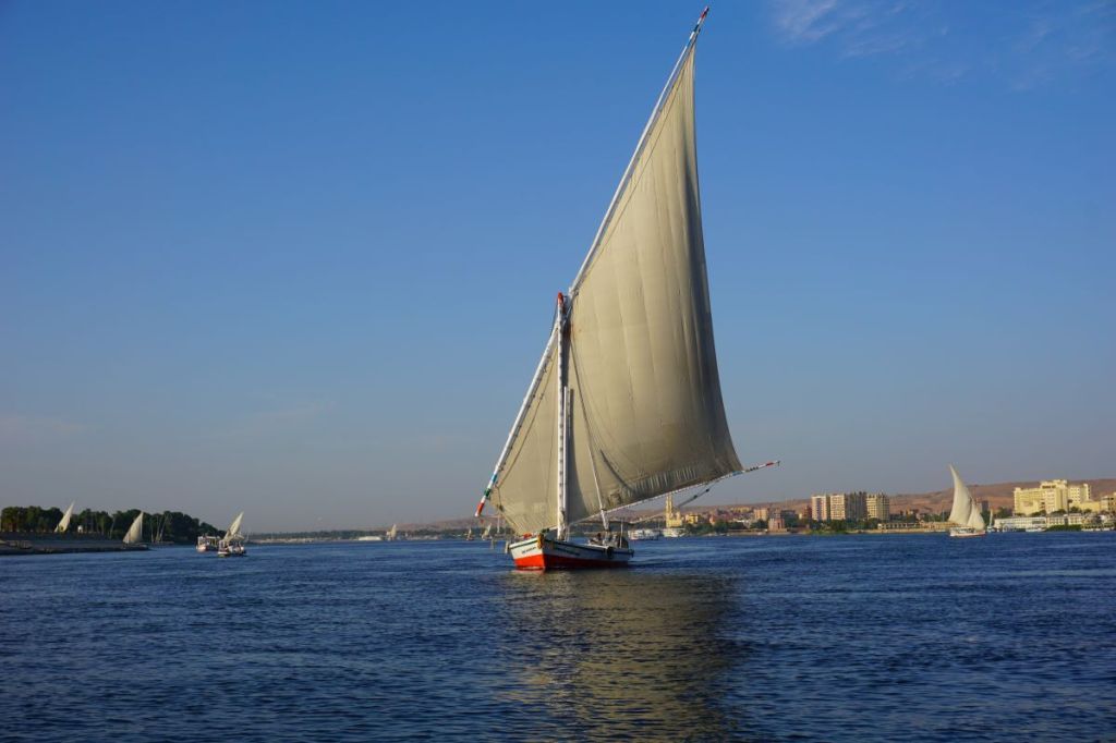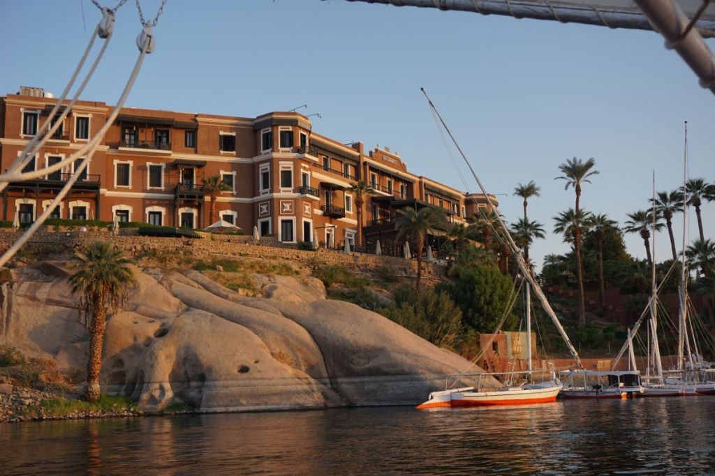 Tras regresar a la 13:00 comemos en el barco y nos damos un chapuzón en la piscina. A las 15:30 hemos quedado con el guía y damos un vuelta en Faluca (barco de vela) por el Nilo viendo la Isla Elefantina y terminando en el Old Cataract, un hotel de lujo que hizo famoso Agatha Christie con su libro Muerte en el Nilo, el cual escribió en el propio hotel. Tomamos un combinado en la terraza del hotel y luego lo vemos por dentro. Es precioso, parece la Alhambra. Vemos los jardines y luego vamos de regreso andando al barco poco a poco.