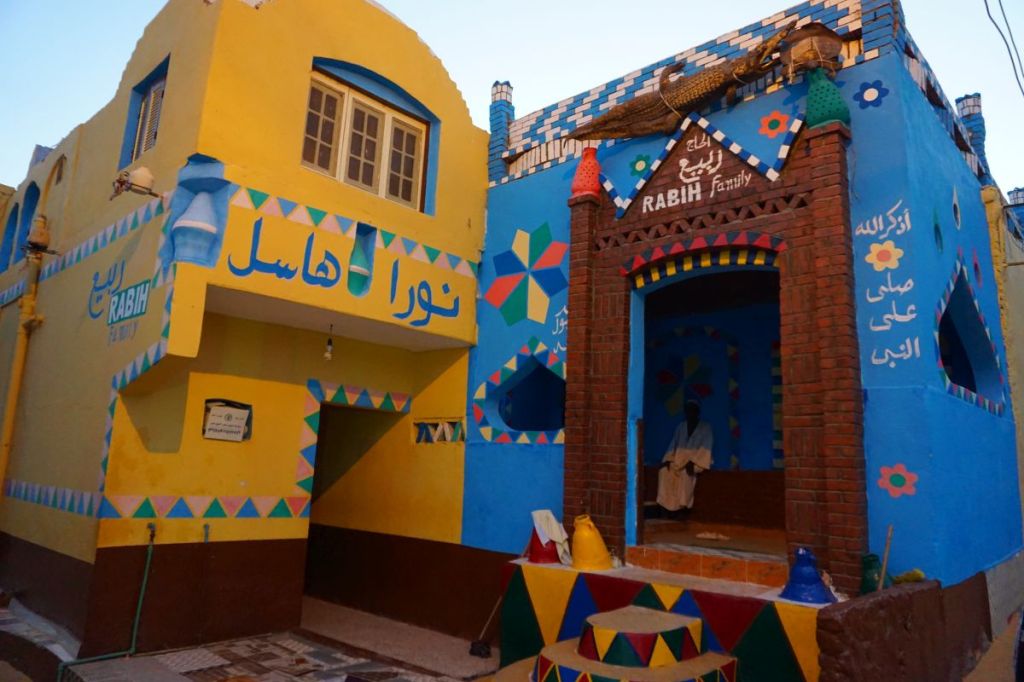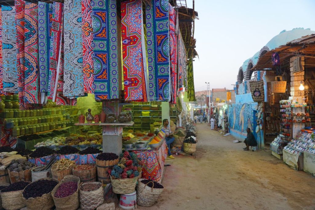 Después vamos al Poblado Nubio. Paseamos por su mercado y vamos a una casa típica Nubia. Es todo muy artificial, está lleno de turistas. Nos esperabamos algo más auténtico. Visitamos la casa y dentro tienen hasta dos cocodrilos enjaulados. Nosotros cogemos la excursión con cena, pensábamos que cenaríamos con la familia nubia, pero únicamente nos sirven la comida. Está todo buenísimo, una carne guisada brutal, sopa, ensalada de verduras hechas, pan casero de ellos… un festín. Después de la cena volvemos al hotel en barco. Encontramos un bar que vende cerveza y echamos un rato allí antes de ir a dormir…
