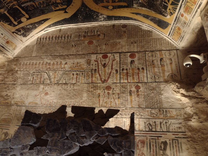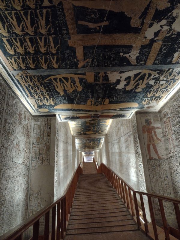 Hoy salimos a las 7:00 del barco y vamos a ver el Valle de los Reyes. En la entrada se incluyen 3 tumbas y aparte pagamos para ver otra. Hay muchas tumbas pero hay que pagar por cada una de ellas a parte. Algunas son bastante caras. La montaña tiene forma de pirámide. No puedo sacar fotos con la cámara, solo con el móvil. Las tumbas que vemos son: Ramesés IX, Merenpetah, Rameses III y la extra que es Rameses V y VI. Son tumbas más grandes que las de los nobles y conservan también pinturas y grabados, incluso en alguna hay sarcófago.